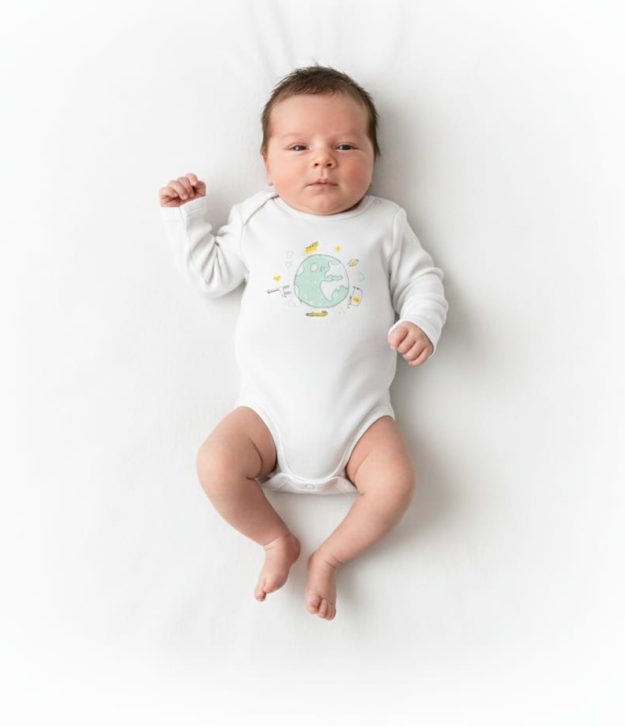 - التصميم: أكمام طويلة، كباسات سفلية لتسهيل تغيير الحفاظ، ياقة مغلقة