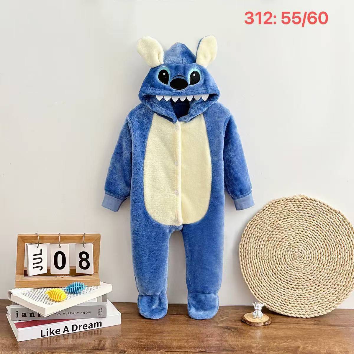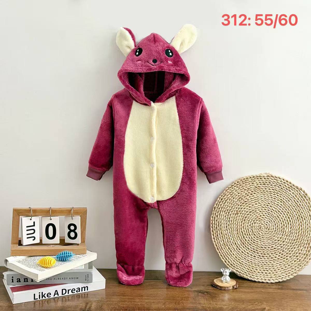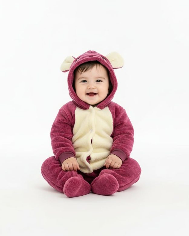 • التصميم: قطعة واحدة بأكمام طويلة، مع قبعة مدمجة تحتوي على أذنين وعيون مطرزة، وسحاب أو أزرار أمامية لسهولة اللبس