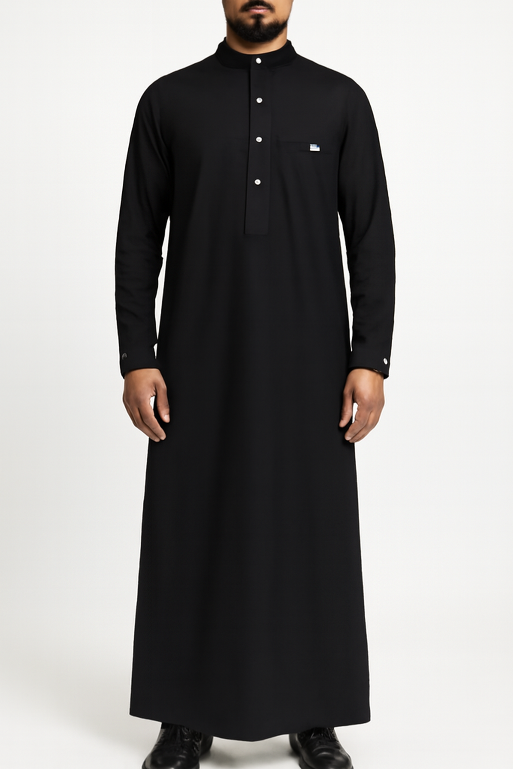 الدشداشة السوداء البسام اللون: أسود فخم يناسب مختلف الأوقات والمناسبات.
