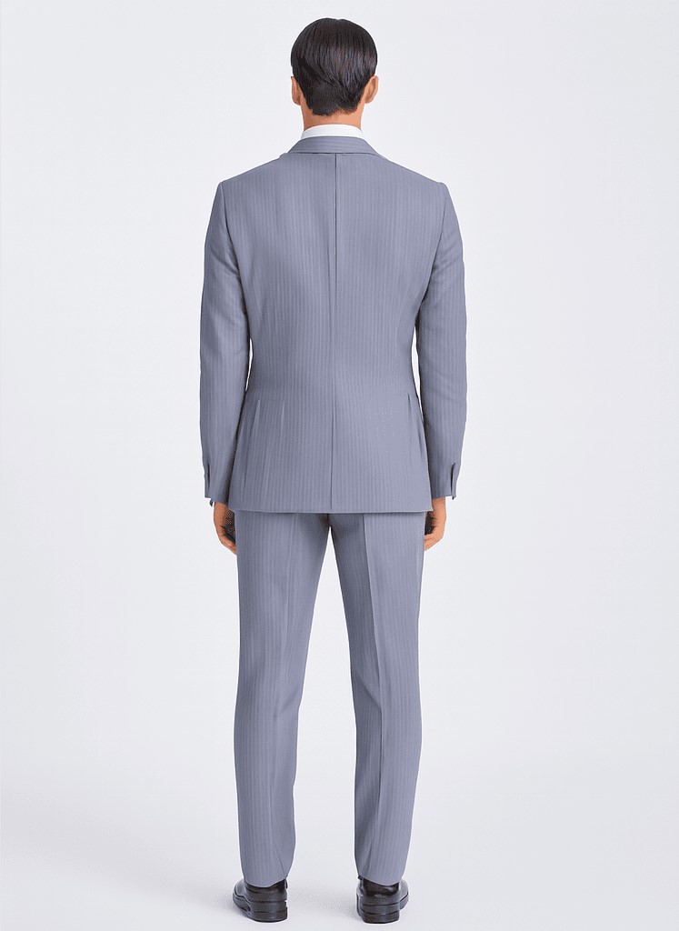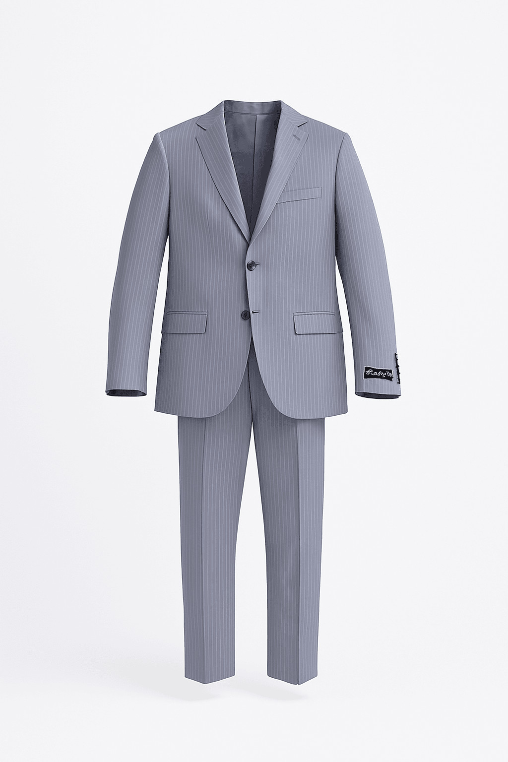 بدلة رسمية أنيقة باللون الرمادي المخطط، مثالية للمناسبات الرسمية والاجتماعات الهامة. تتميز هذه البدلة بتصميم عصري مع خطوط رفيعة تعكس الأناقة والفخامة. الجاكيت يأتي مع ياقة أنيقة وأزرار مزدوجة، بينما السروال بقصة مستقيمة لتوفير مظهر رسمي أنيق.