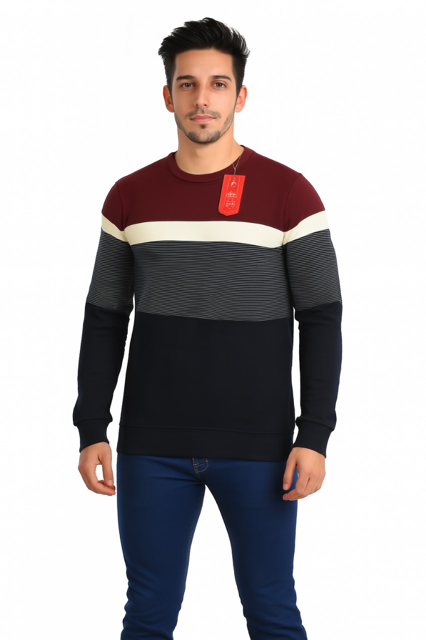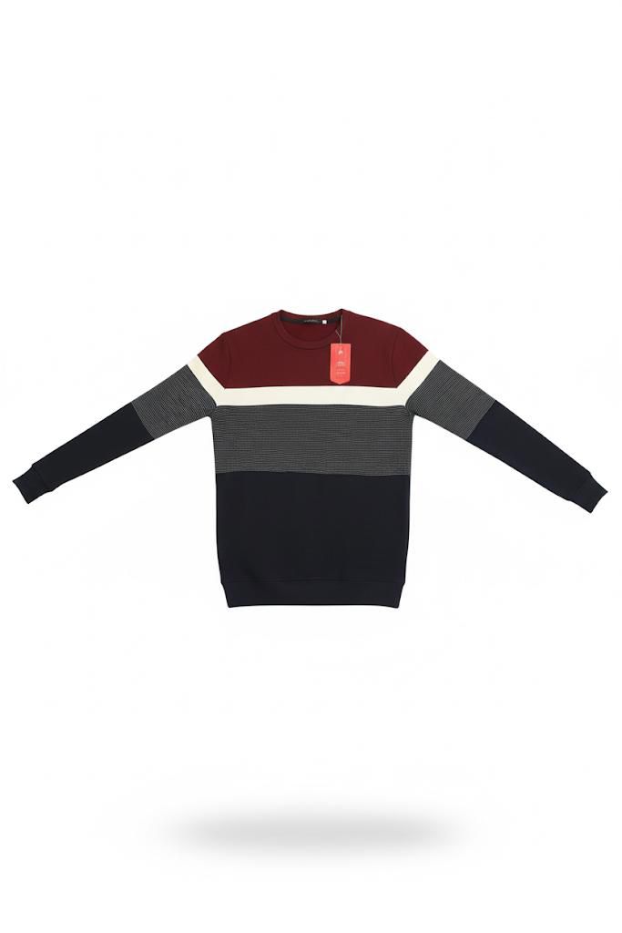 بلوز رجالي أنيق بتصميم شتوي عصري يجمع بين اللون الكحلي في الأسفل، والخمري في الأعلى مع تفاصيل رمادية وخط بيج يمنح مظهراً متناسقاً وجذاباً. مناسب للإطلالات اليومية أو الكاجوال في الأجواء الباردة.