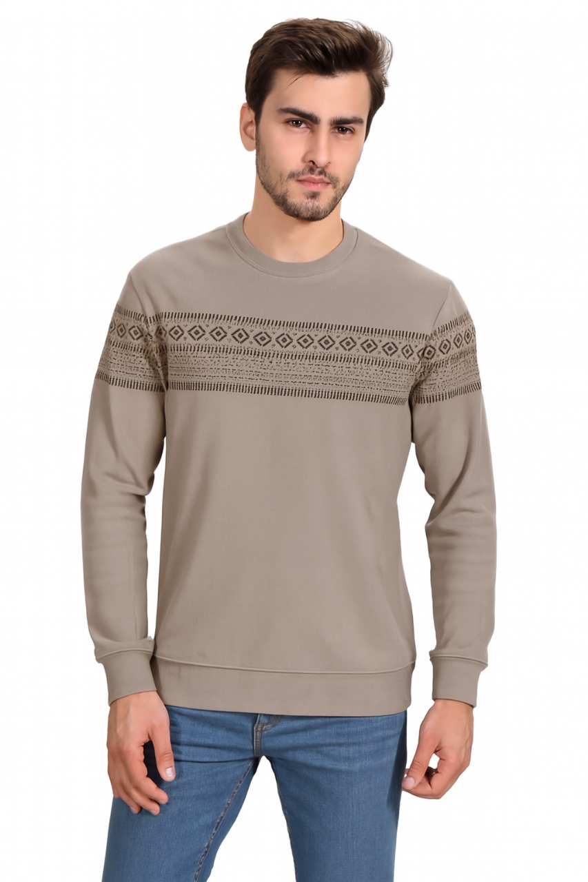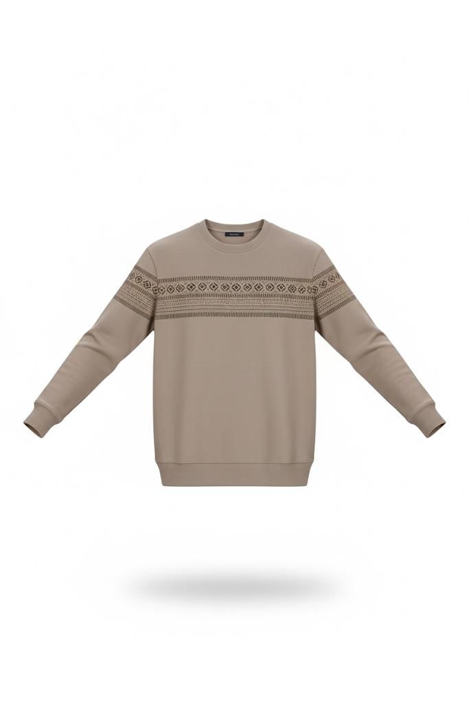 بلوز رجالي شتوي بتصميم أنيق وراقي، يتميز بلونه البيج العصري مع نقشة هندسية خفيفة على منطقة الصدر والأكمام، مما يمنحه مظهراً جذاباً وهادئاً يناسب الإطلالات اليومية والمناسبات الكاجوال. مصنوع من خامة ناعمة توفر الدفء والراحة في فصل الشتاء.