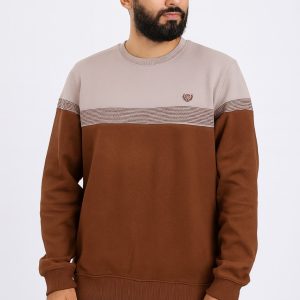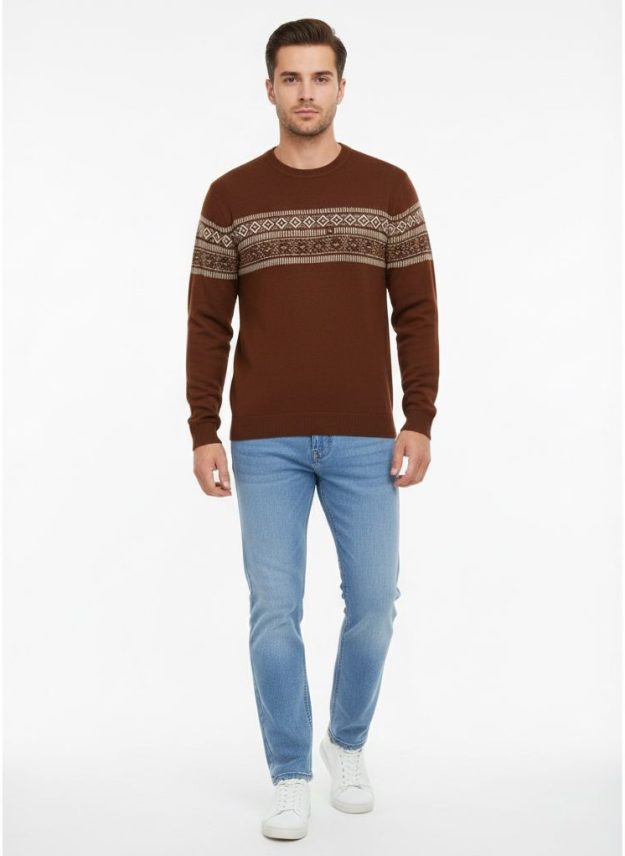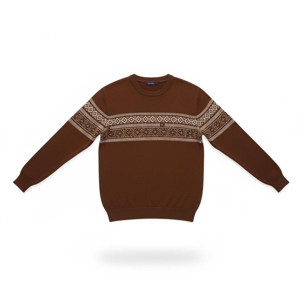بلوز رجالي شتوي أنيق بلون بني جذاب مع نقشة هندسية تقليدية بلون البيج تمتد عبر الصدر والأكمام، لتمنح مظهراً كلاسيكياً راقياً يناسب فصل الشتاء. يتميز بتصميم مريح وخامة عالية الجودة توفر دفئاً وأناقة في آن واحد.