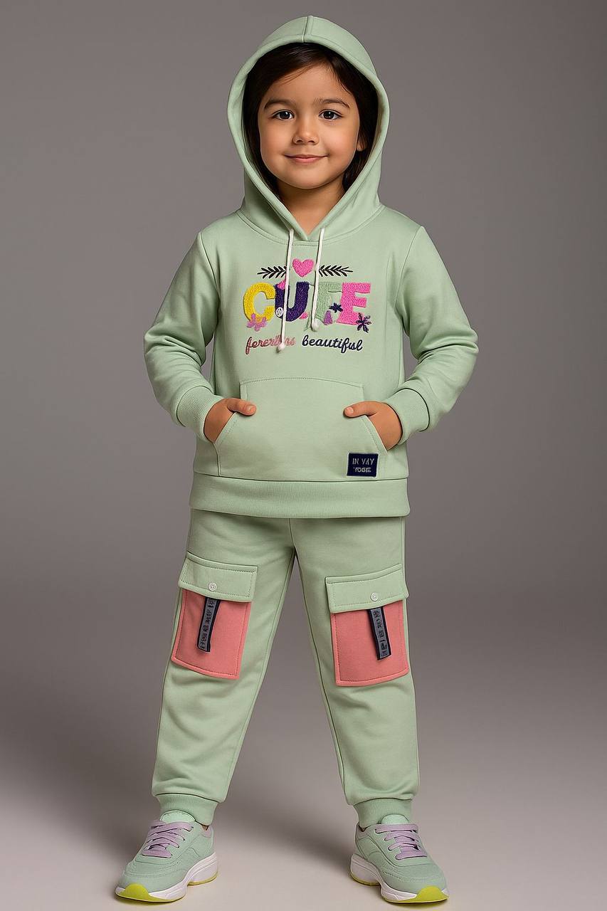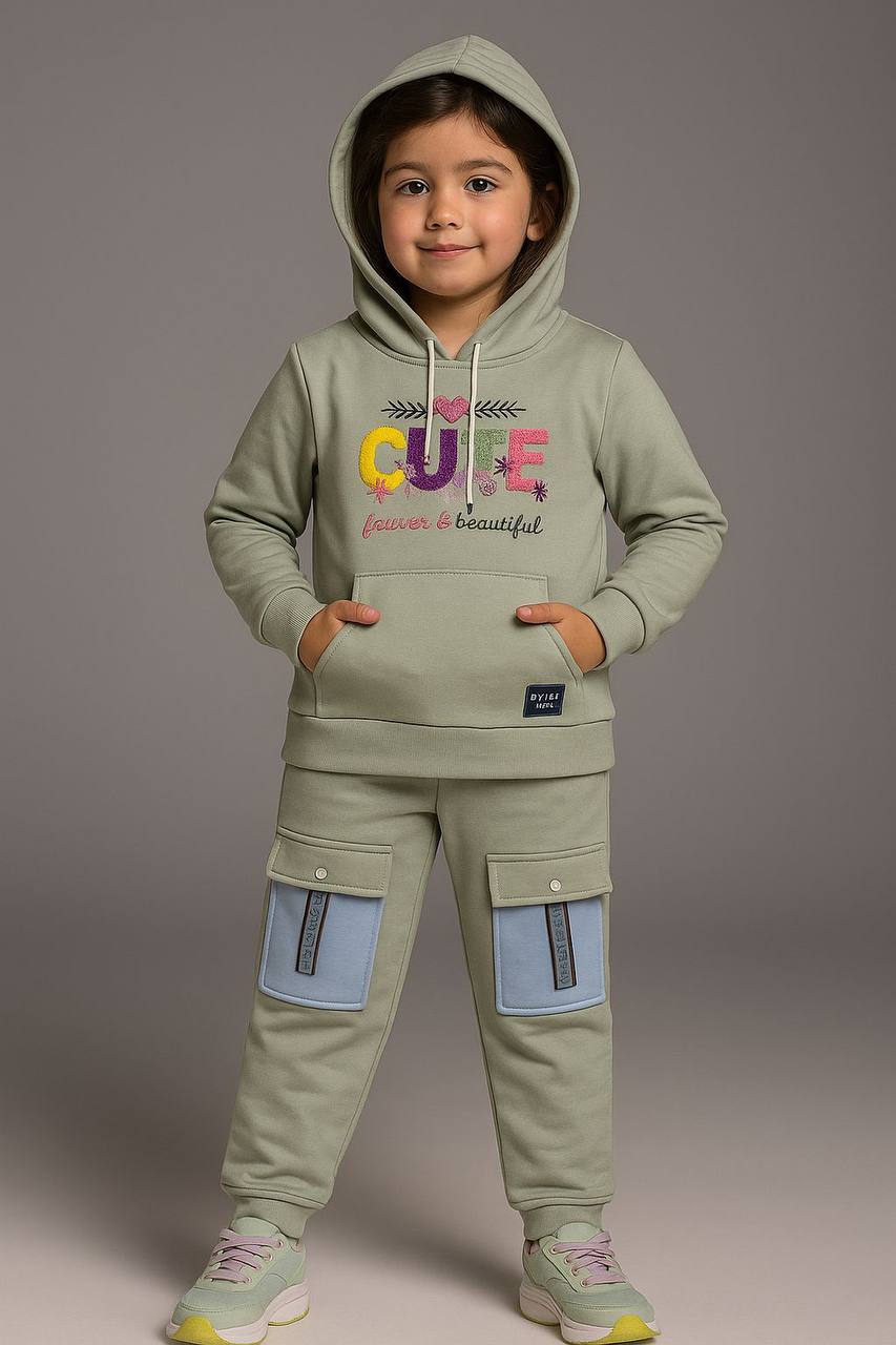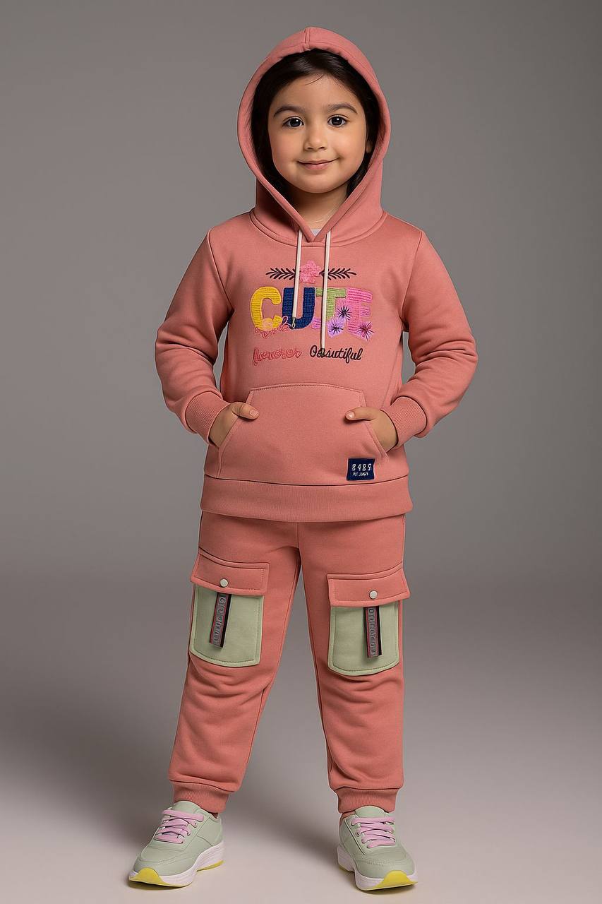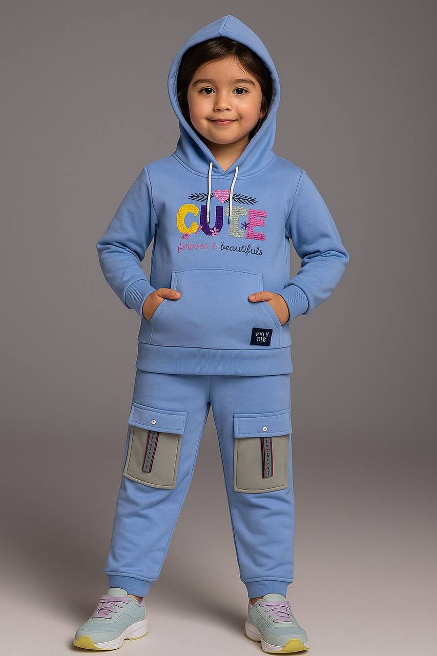 طقم شتوي بناتي مكوّن من هودي بأكمام طويلة وسروال متناسق، بتصميم عصري يجمع بين الراحة والمرح. يتميز بطبعة CUTE forever & beautiful برسومات ملونة تضيف لمسة طفولية جذابة، مع جيوب أمامية كبيرة تضيف طابعًا عمليًا ومميزًا.
