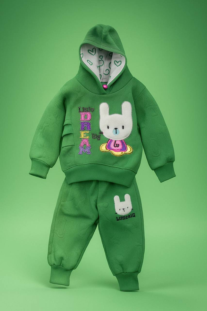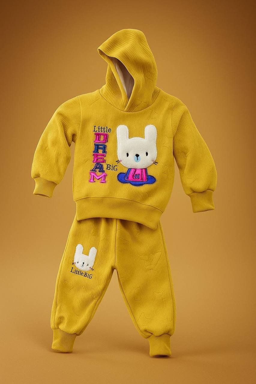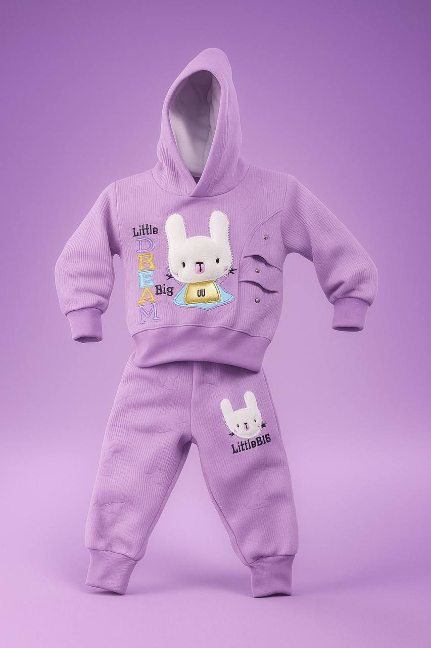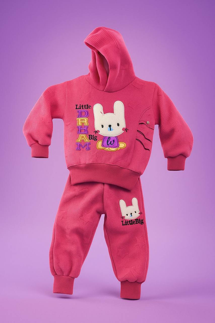 تراك شتوي بناتي مكوّن من هودي وسروال متناسق، بتصميم طفولي جذاب يجمع بين الراحة والمرح. يتميز بطبعة أرنب ثلاثية الأبعاد مع عبارة Little Dream Big مطرزة بألوان مرحة، مما يمنح الطفلة إطلالة دافئة ومبهجة في الشتاء.