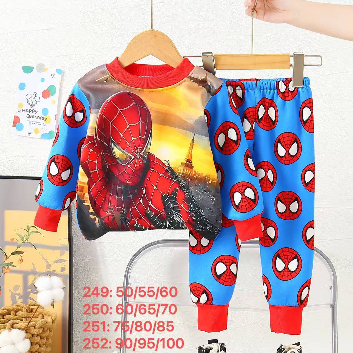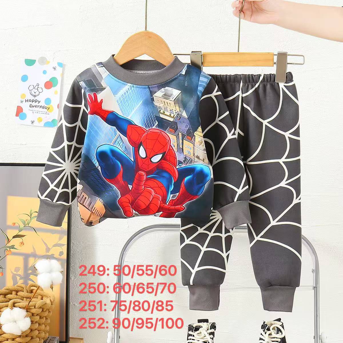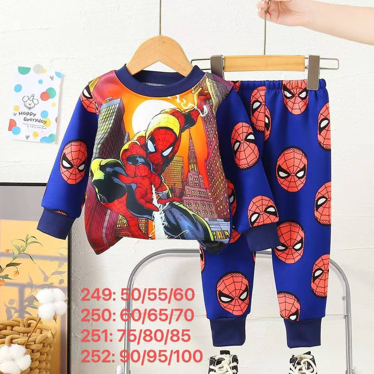تراك شتوي ولادي بتصميم مستوحى من شخصية سبايدرمان المحبوبة، يجمع بين الراحة والستايل المرح. يتكوّن من بلوزة طويلة الأكمام برسمة كبيرة لسبايدرمان وهو يتأرجح بين المباني في مشهد غروب المدينة، وسروال متناسق مزين بشعارات وجه سبايدرمان المتكررة، ليمنح الطفل إطلالة مليئة بالحيوية والطاقة.