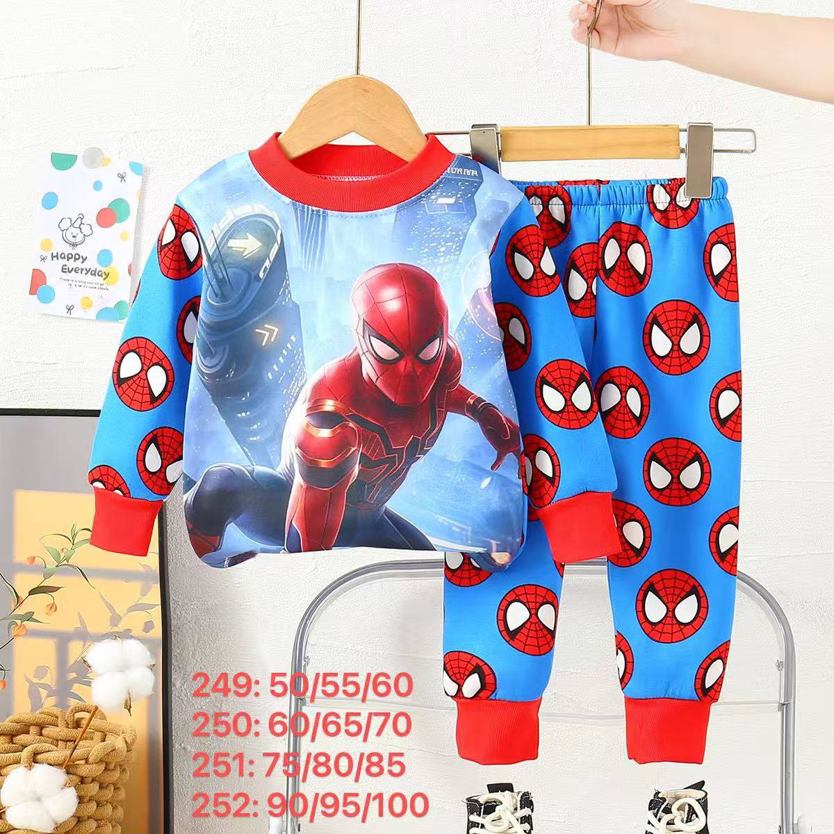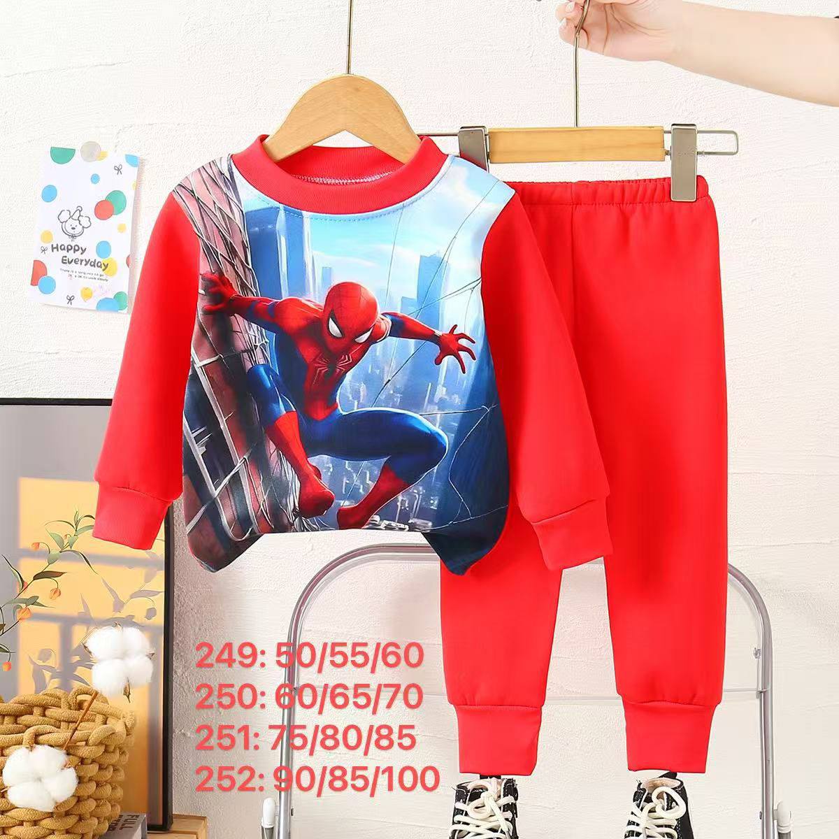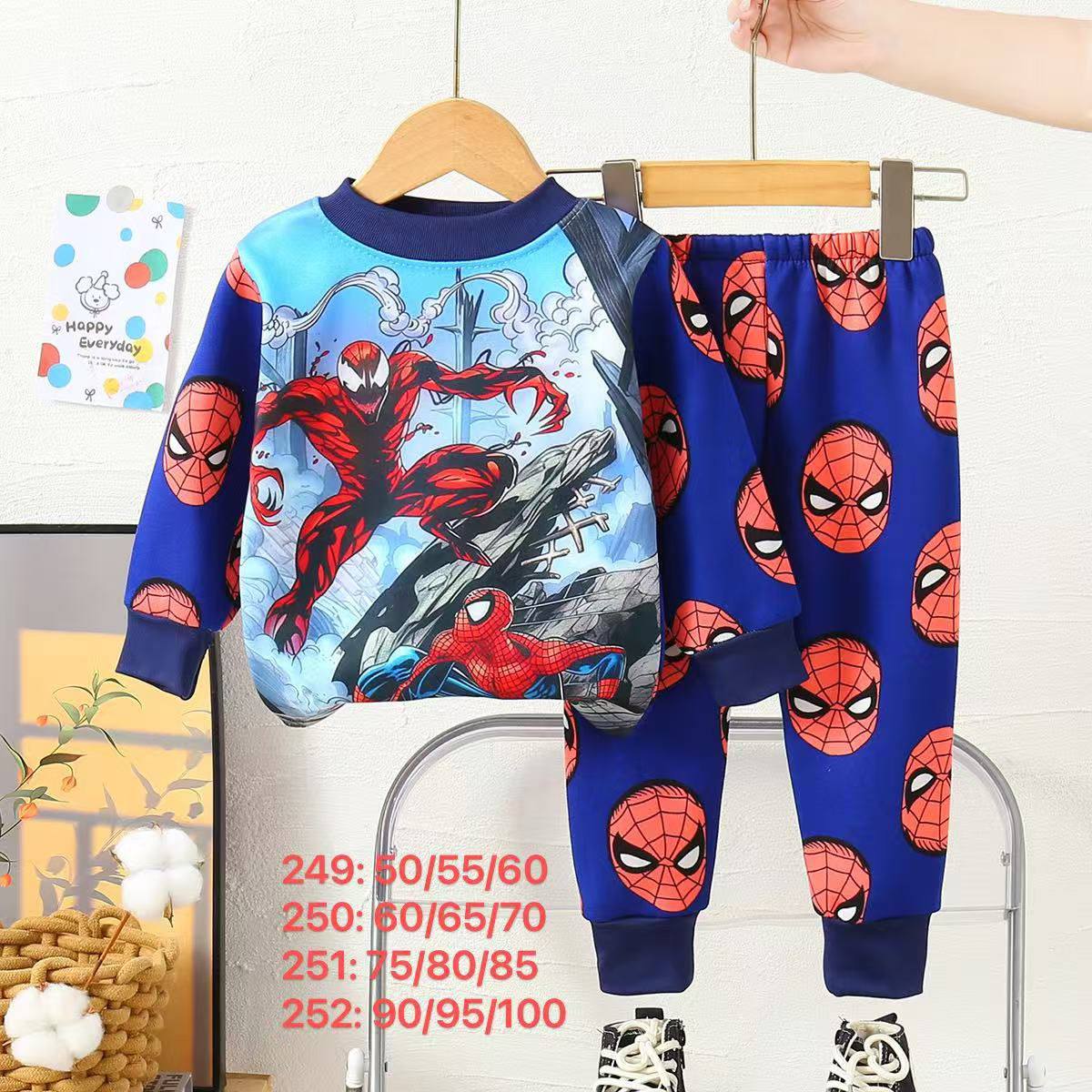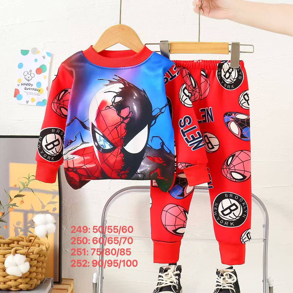 تراك شتوي ولادي بتصميم مستوحى من شخصية سبايدرمان المحبوبة، يجمع بين الراحة والستايل المرح. يتكوّن من بلوزة طويلة الأكمام برسمة كبيرة لسبايدرمان وهو يتأرجح بين المباني في مشهد غروب المدينة، وسروال متناسق مزين بشعارات وجه سبايدرمان المتكررة، ليمنح الطفل إطلالة مليئة بالحيوية والطاقة.