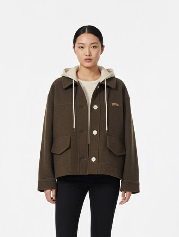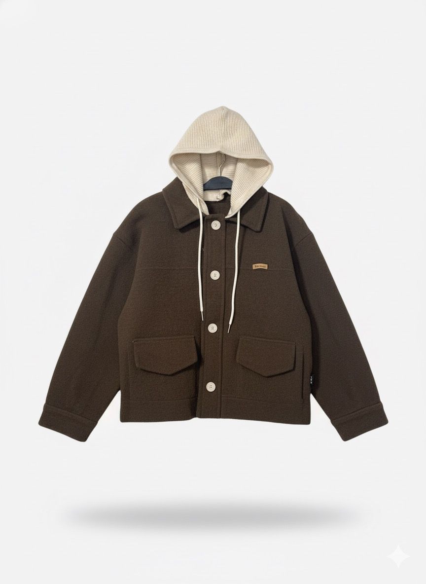 اللون: بني داكن مع قبعة بيجالخامة: صوف ثقيل ببطانة ناعمةالإغلاق: أزرار أماميةالجيوب: أمامية بغطاءالتصميم: قبعة داخلية محاكة بخيوط قطنية