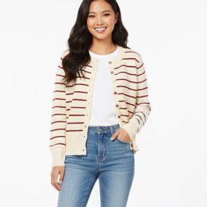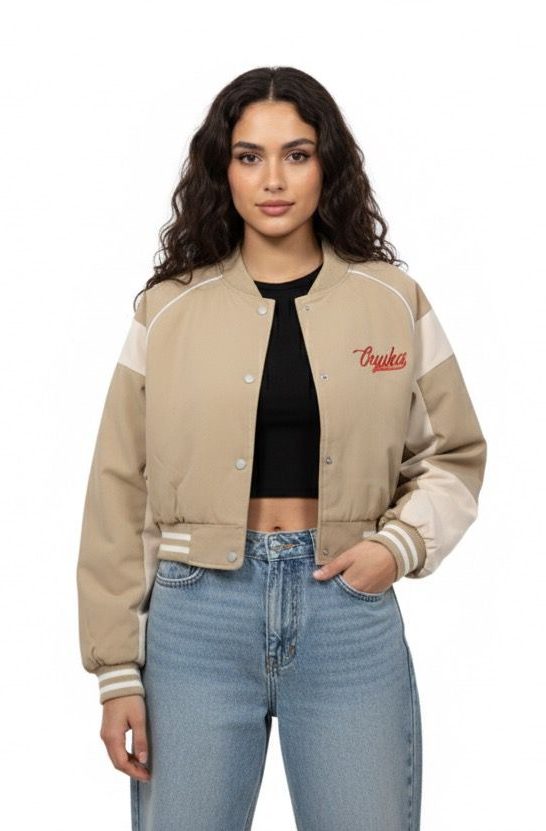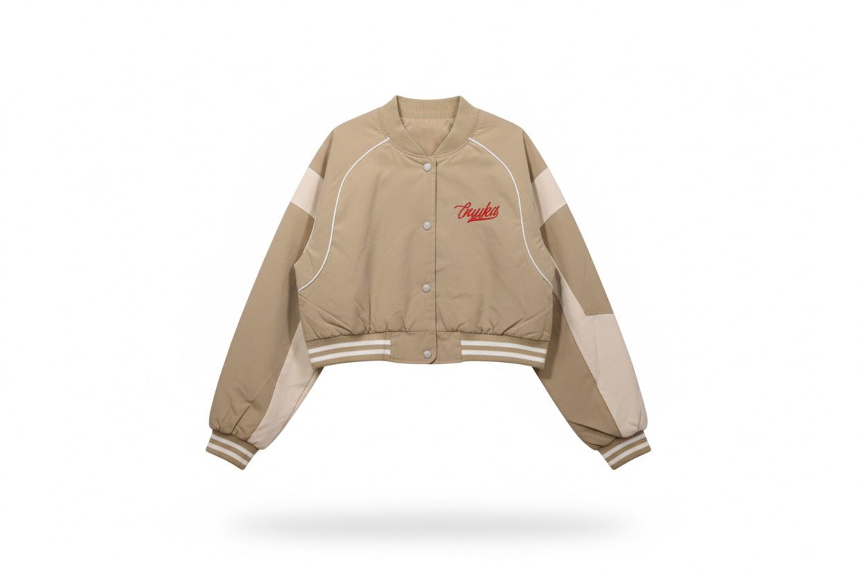 جاكيت نسائي أنيق بطابع رياضي مميز يجمع بين الراحة والأناقة. يتميز بتصميم قصير (كروب) باللون البيج الفاتح مع لمسات كريمية وكتابة باللون الأحمر تمنحه لمسة شبابية ملفتة.