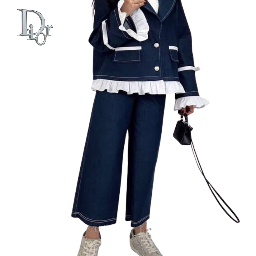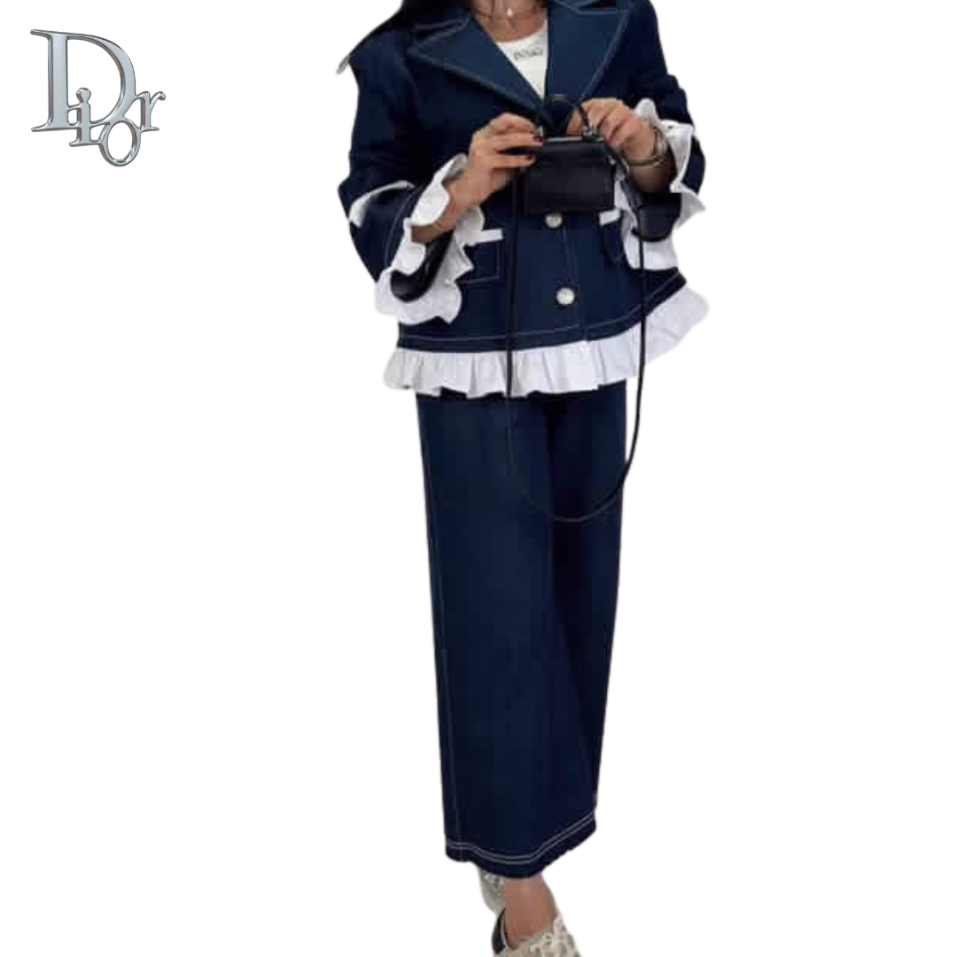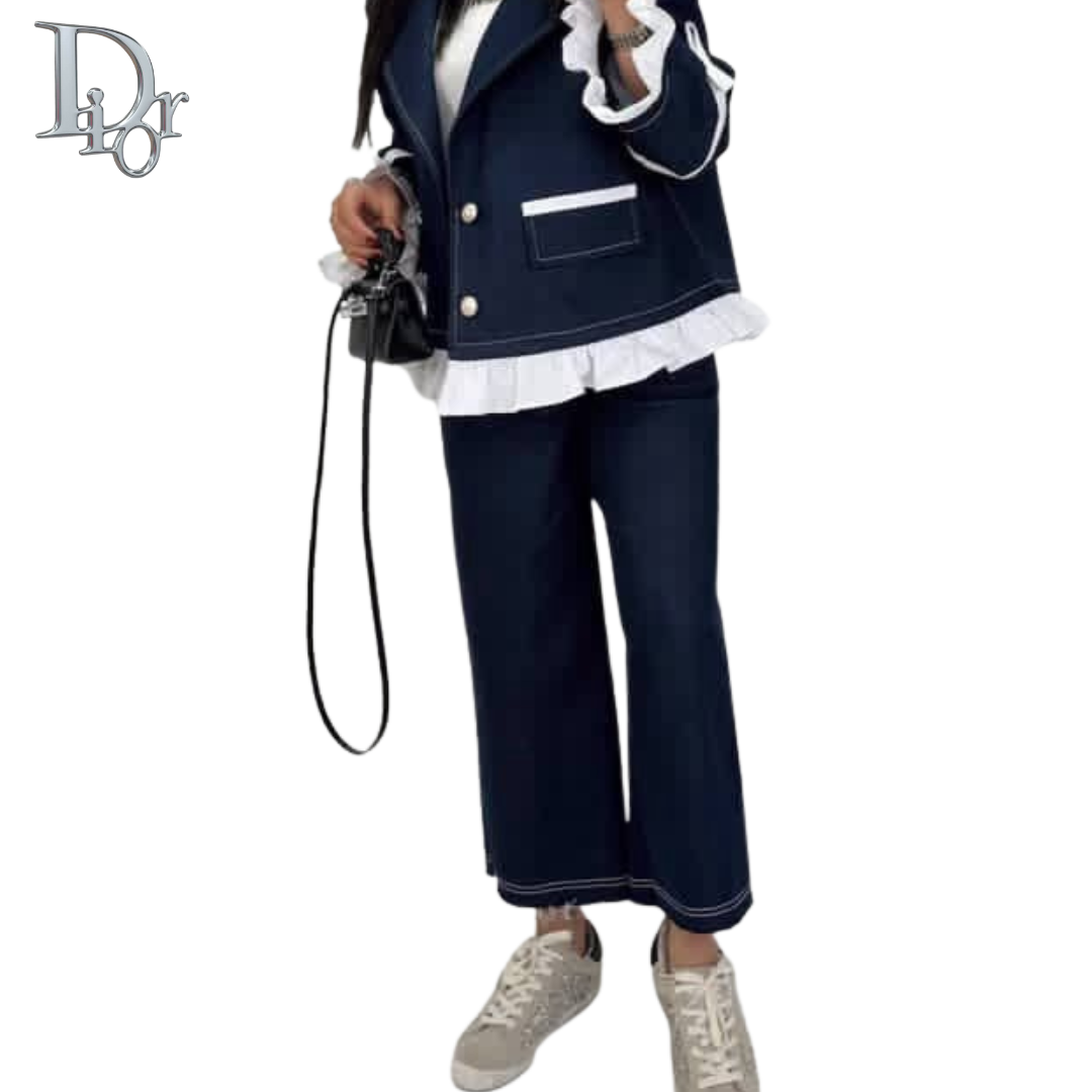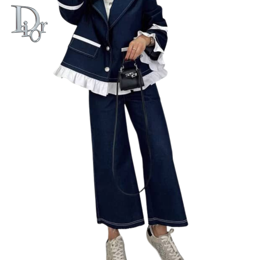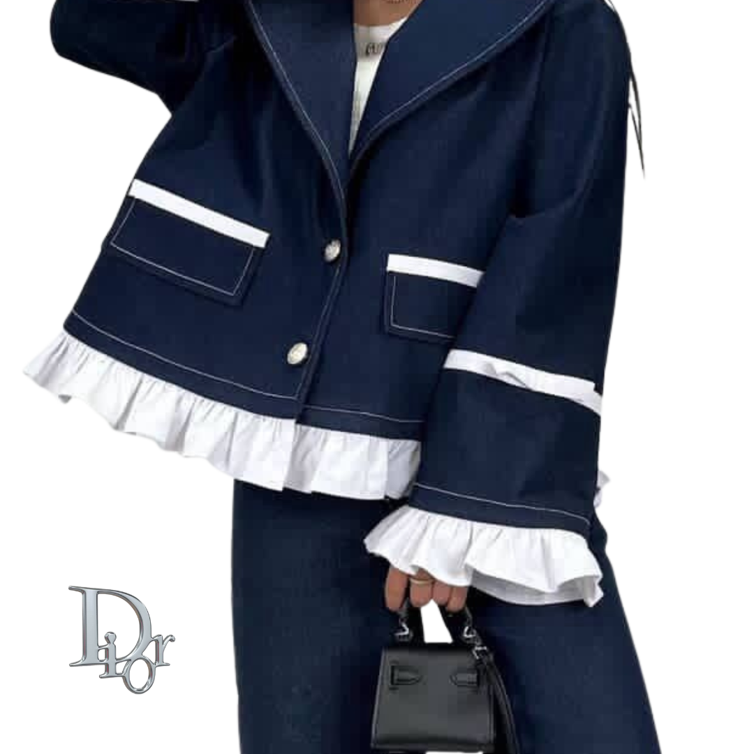 1. الجاكيت: جاكيت من الدنيم الداكن مع تفاصيل من اللون الأبيض عند الأساور والأطراف. يحتوي الجاكيت على جيوب صغيرة وتفاصيل من الدانتيل الأبيض حول الحواف والياقة.