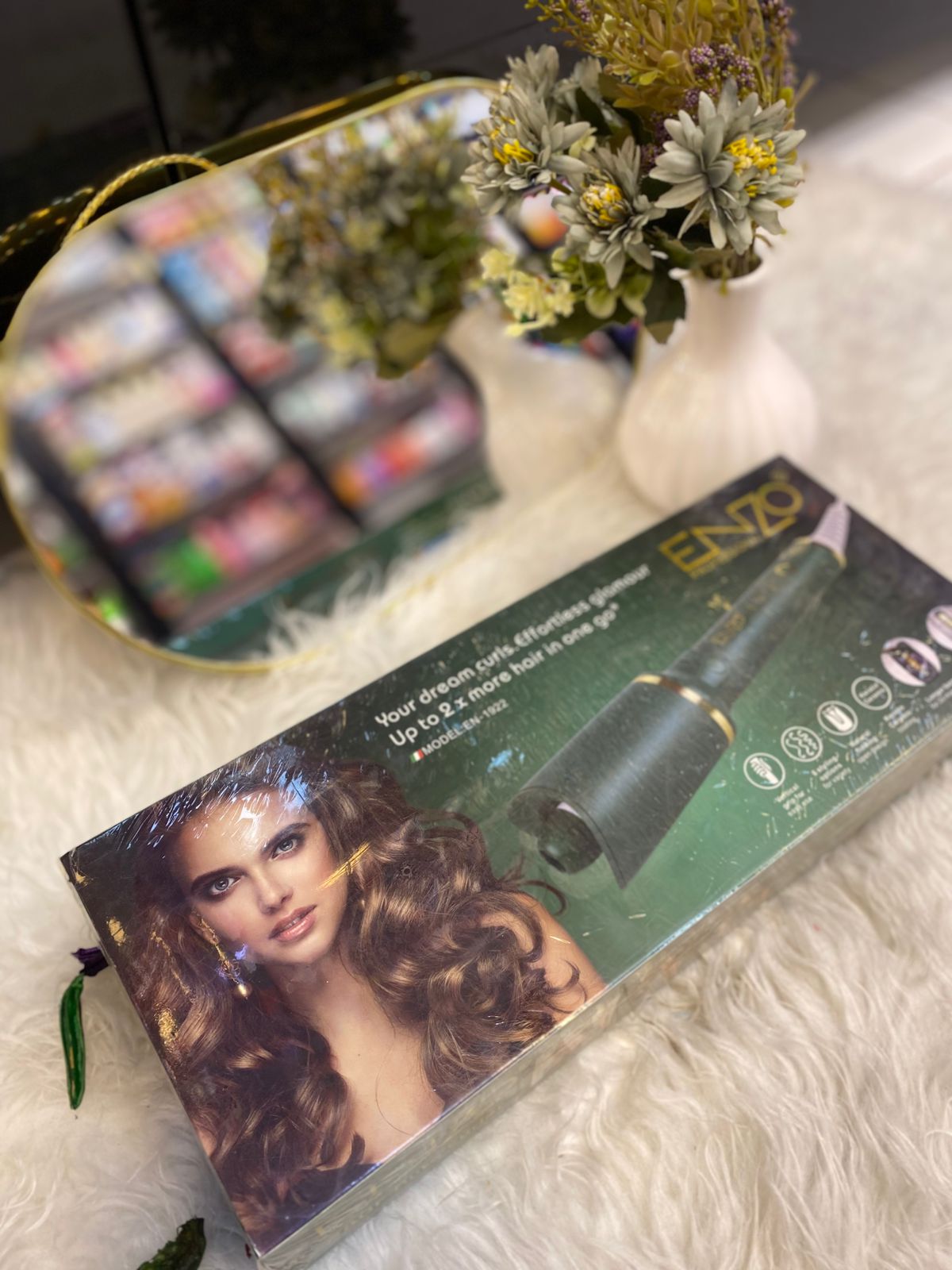 جهاز لتصفيف الشعر مع العديد من المميزات التي تساعد في الحصول على تسريحات شعر مموجة أو مرتبة. النص المكتوب على العلبة يشير إلى بعض المزايا التي قد يحتوي عليها الجهاز: