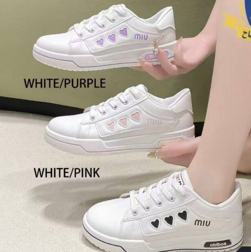- التصميم: قلوب جانبية بلون مميز حسب الموديل، شعار miu على اللسان، ونقشة obbos على النعل