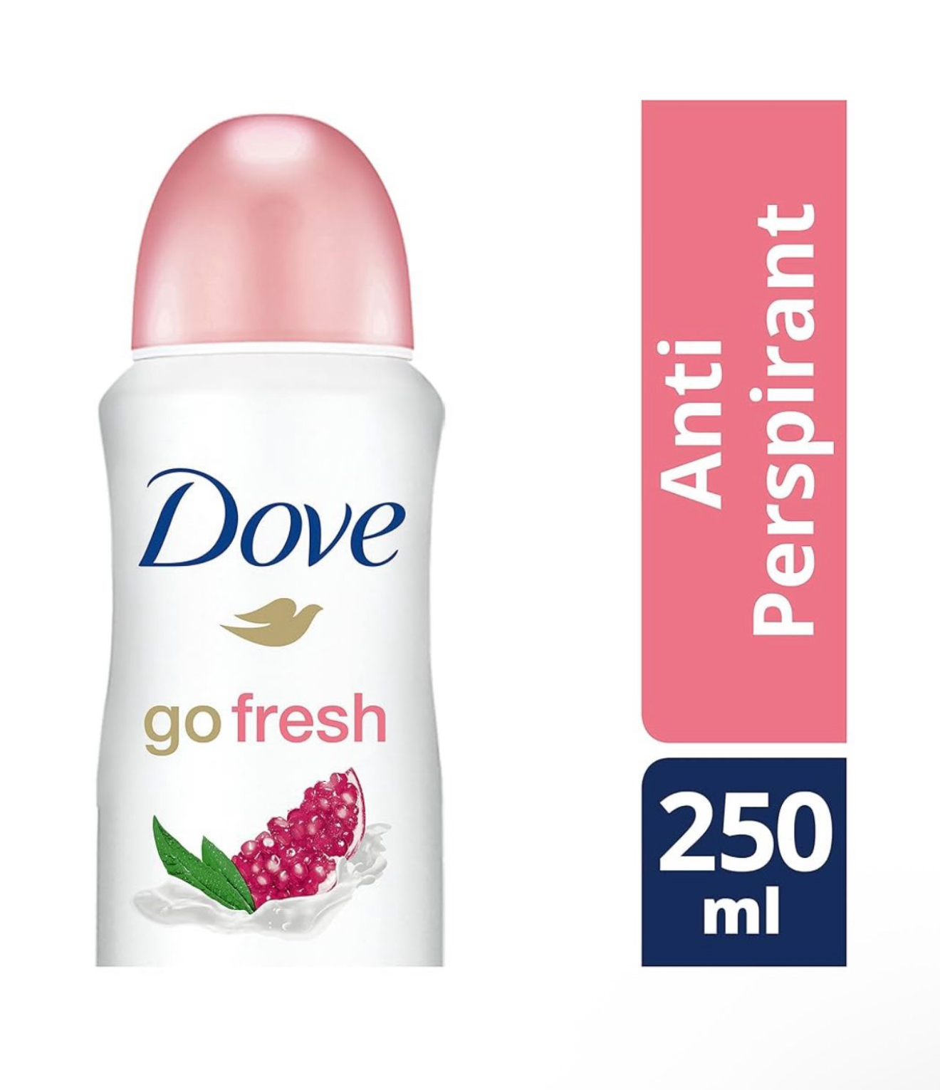 **قائمة المكونات الأساسية لمعطر دوف رمان (Dove Go Fresh Pomegranate):** – بوتان (Butane) – أيزوبوتان (Isobutane) – ألومنيوم كلورهيدريت (Aluminum Chlorohydrate) – زيت بذور دوار الشمس (Helianthus Annuus Seed Oil) – ماء (Aqua) – كابريليك/كابريك تراي غليسيرايد (Caprylic/Capric Triglyceride) – عطر (Parfum) – مستخلص الرمان (Punica Granatum Extract) – دايميثيكون (Dimethicone) – جلسرين (Glycerin) هذه التركيبة تمنح الحماية من التعرق، الترطيب، نعومة البشرة، ورائحة الرمان الفاخرة مع لمسة من الحماية اللطيفة دون كحول.