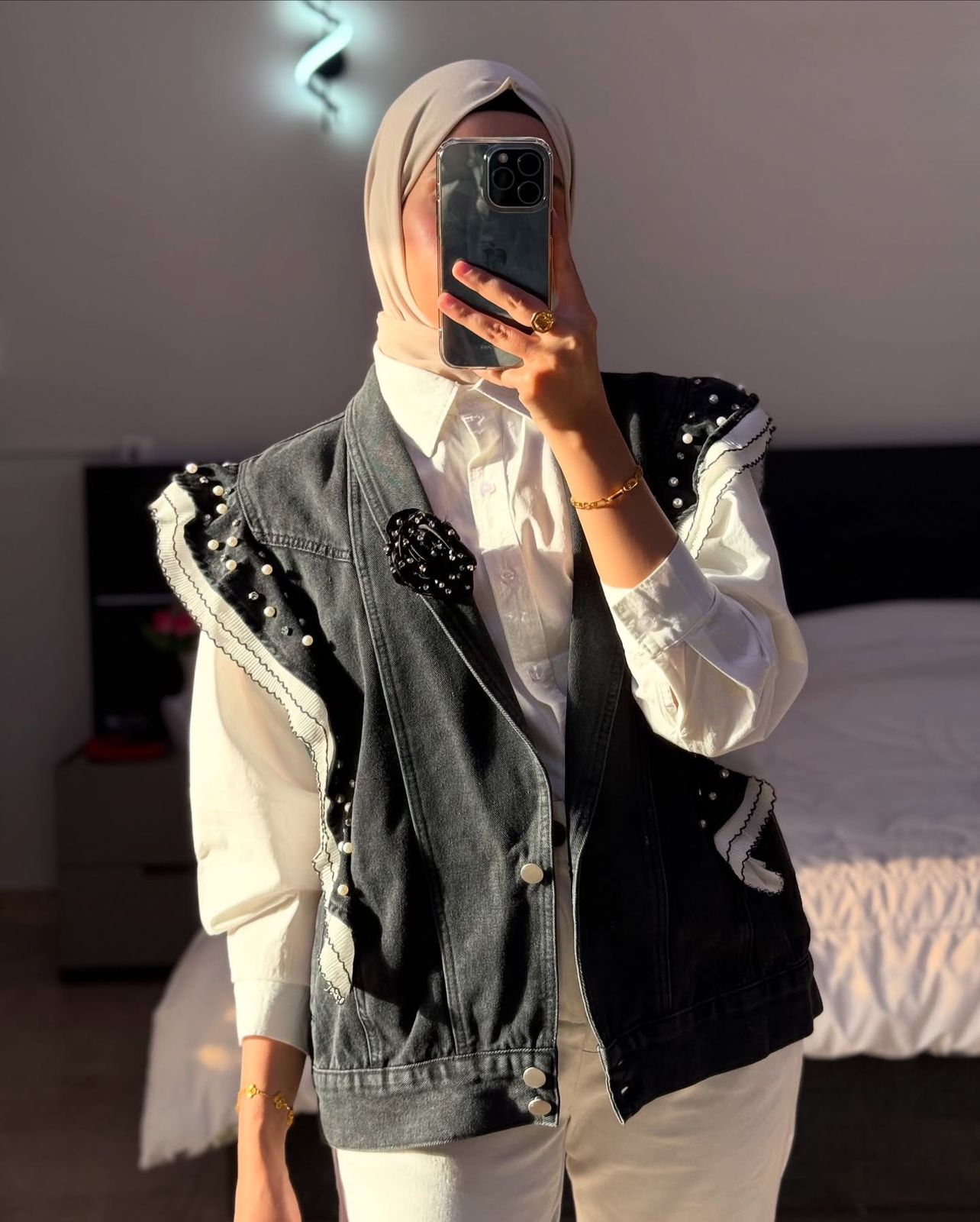 سترة جينز سوداء ذات تصميم مميز. تمت إضافة تفاصيل جميلة للسترة مثل التطريزات البيضاء والخرز الذي يزين الأكتاف والجانبين. كما يتم ارتداء القميص الأبيض تحت السترة، فيمكن وصفه كسترة جينز بأزرار لأسفل، مع تفاصيل زخرفية في الجزء العلوي من الأكتاف والجانبين.