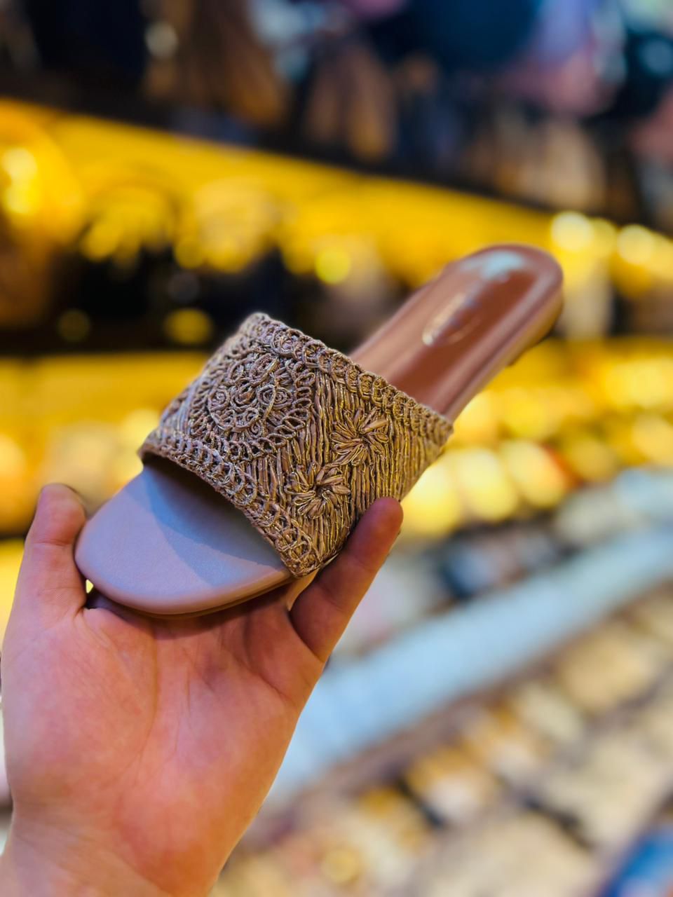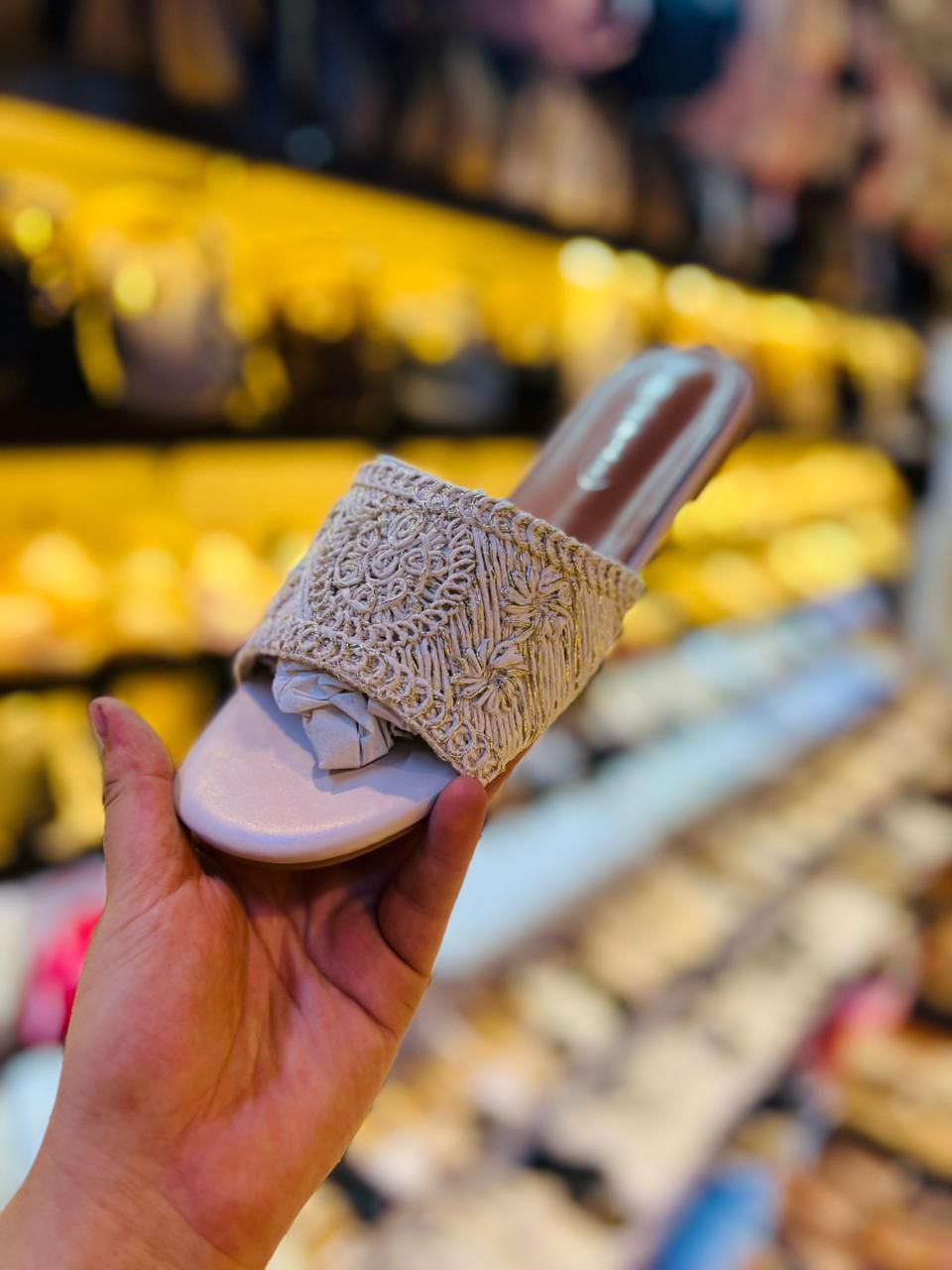 شبشب مفتوح من الأمام بتصميم عصري وأنيق. الحذاء ذو لون فاتح يميل إلى البيج، وهو مزخرف بنقوش رائعة على الجزء العلوي من الحذاء، مما يضفي عليه طابعاً مميزاً وفريداً. التصميم يشمل تفاصيل دقيقة في الخيوط التي تشكل النقوش، مما يبرز جودة الصنع. الحذاء يبدو مريحاً ويحتوي على قاعدة منخفضة، مما يجعله مناسبًا للارتداء اليومي أو المناسبات غير الرسمية. 3 الوان مميزة