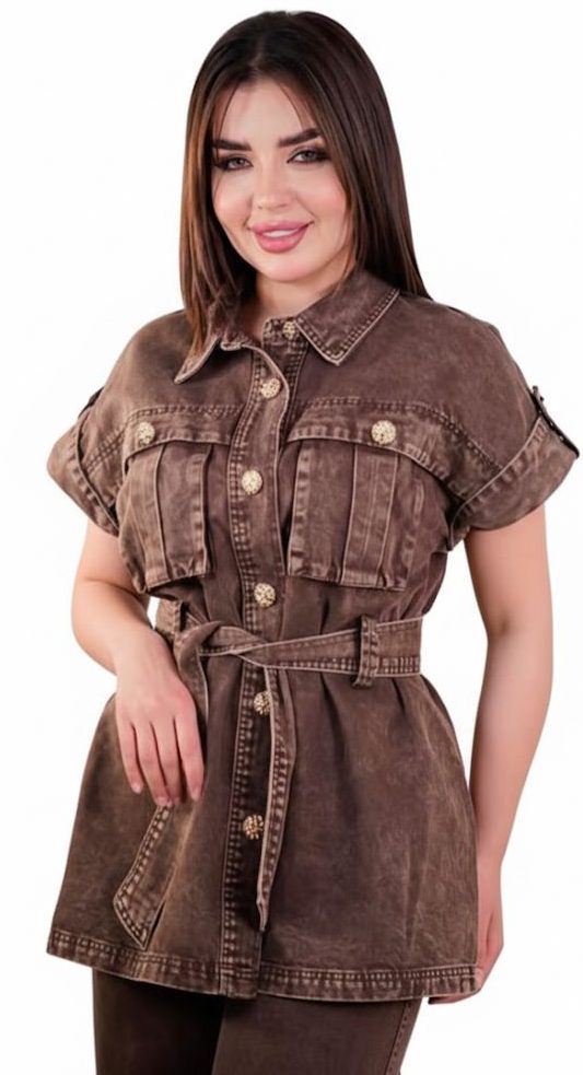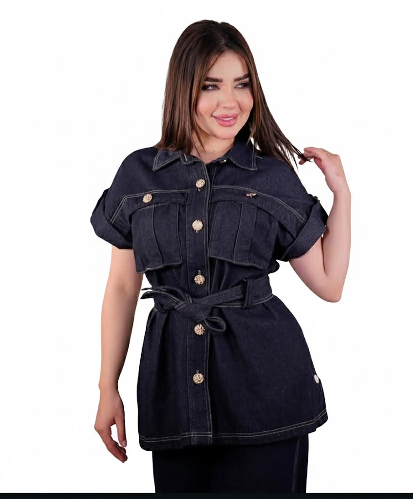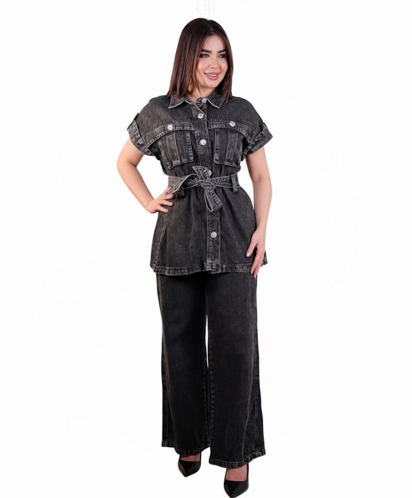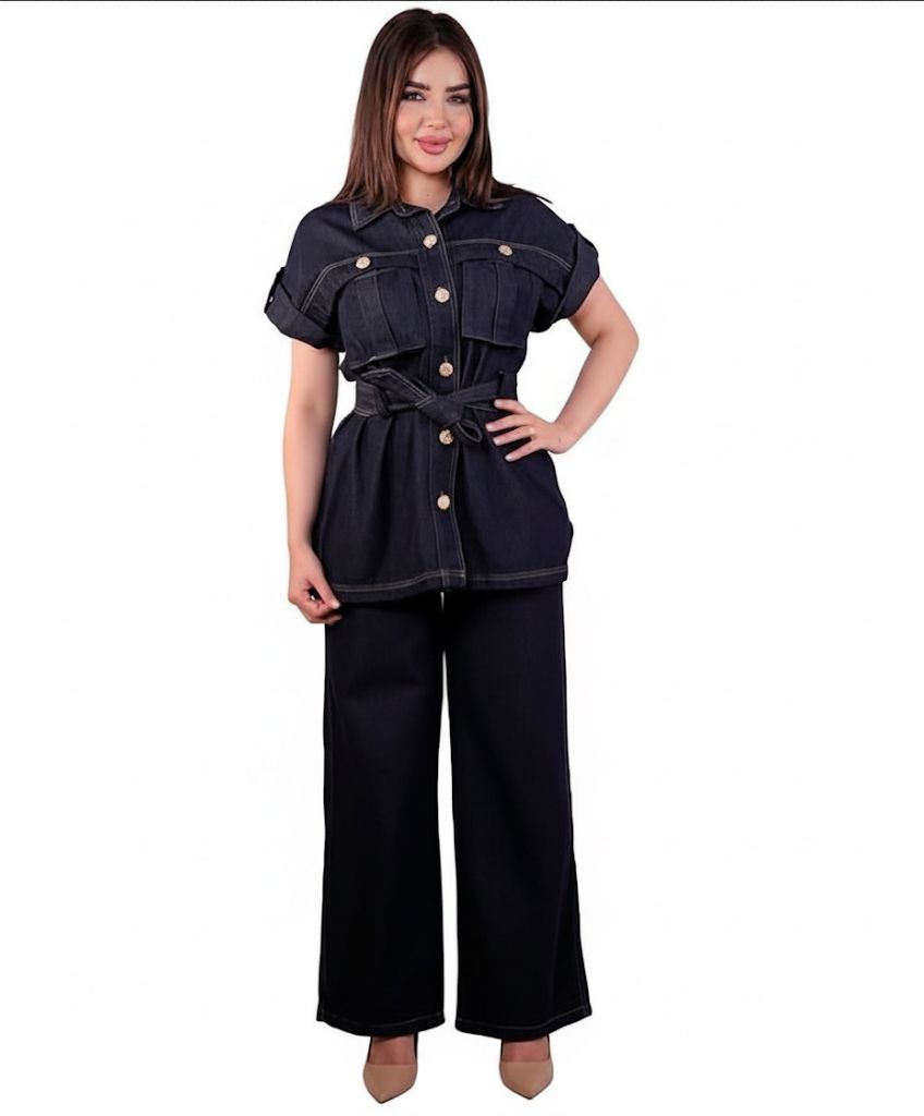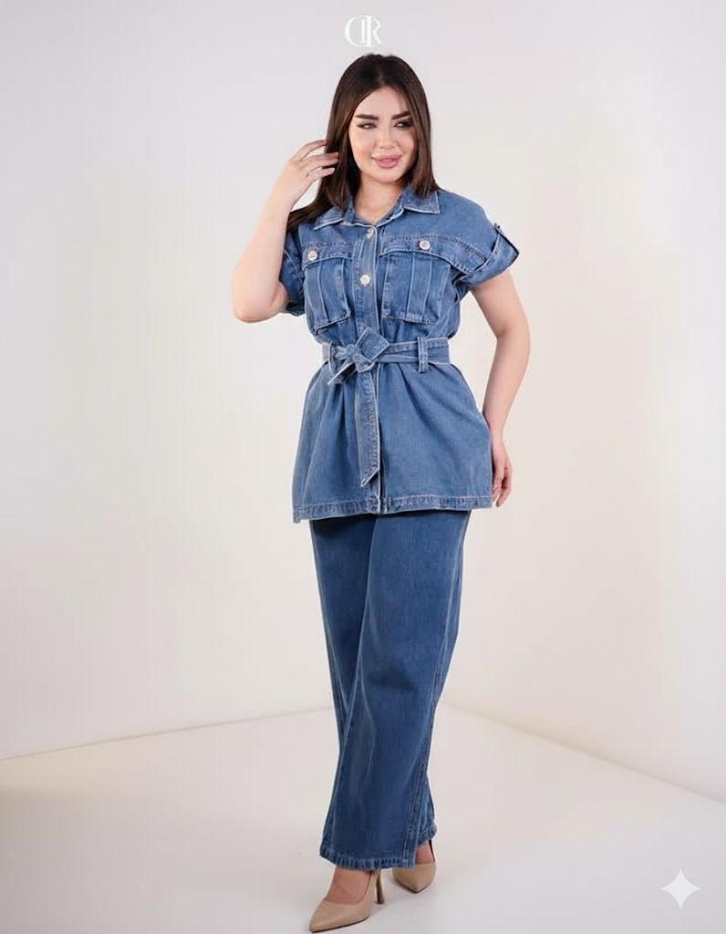 تألّقي بإطلالة أنثوية تجمع بين الفخامة والراحة! طقم جينز من قطعتين مصنوع من قماش دنيم ناعم وعالي الجودة ، يتميز بقصة عصرية تمنحك مظهرًا جذّابًا ومريحًا في الوقت نفسه.