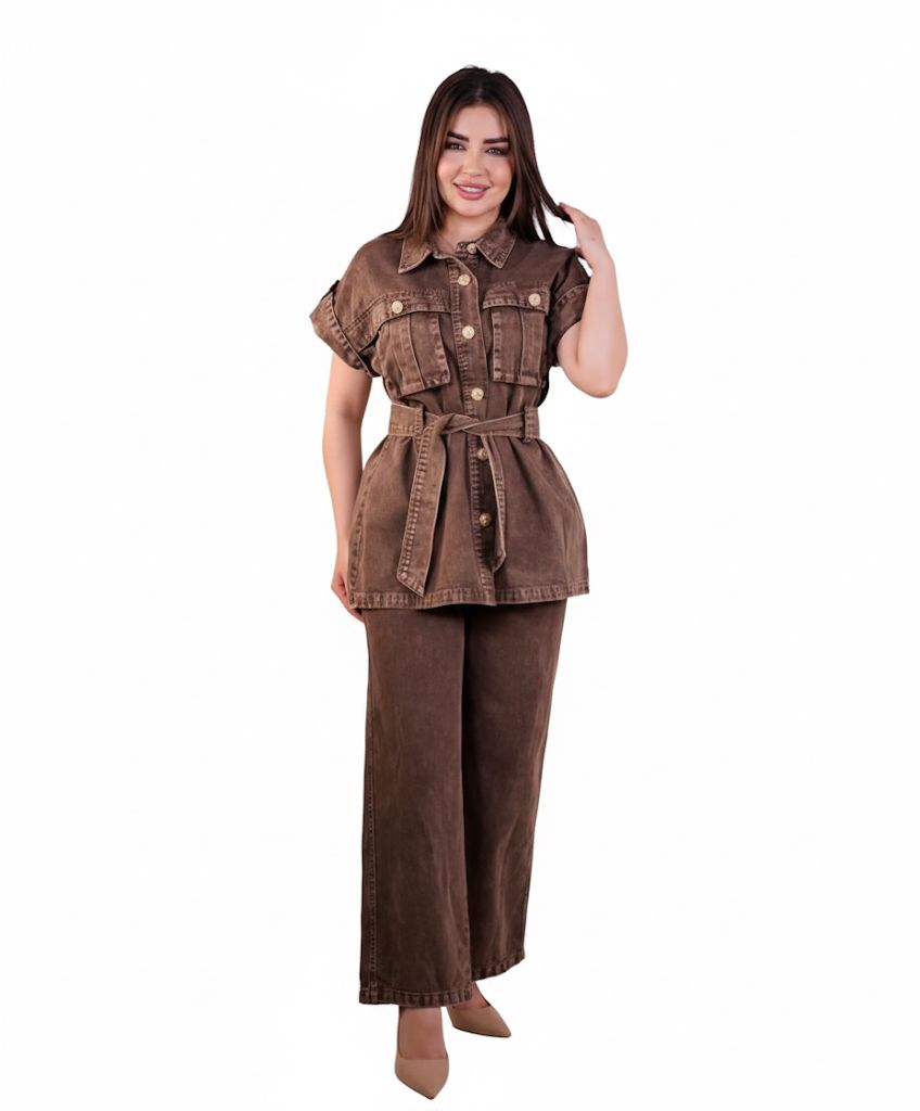 الكنزة بتصميم يشبه الجاكيت القصير بأكمام قابلة للثني ، مع أزرار معدنية فاخرة تضيف لمسة من التميّز، ويأتي معها حزام خصر بنفس القماش ليبرز جمال القوام. أما البنطال فهو بقصّة مستقيمة وواسعة تمنحك حرية الحركة وأناقة متكاملة.