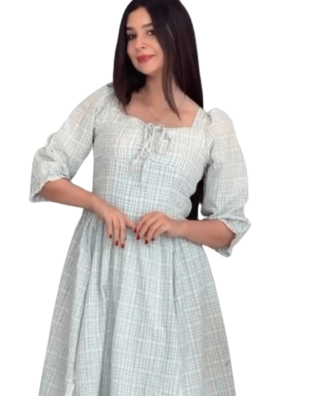 اللون والتصميم: الفستان باللون الفاتح مع نقوش مربعة بلونين مختلفين، مما يعطيه مظهرًا عصريًا وأنيقًا.