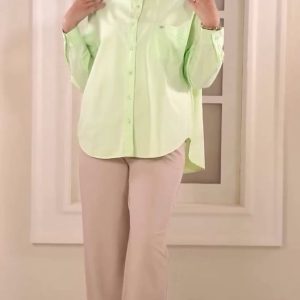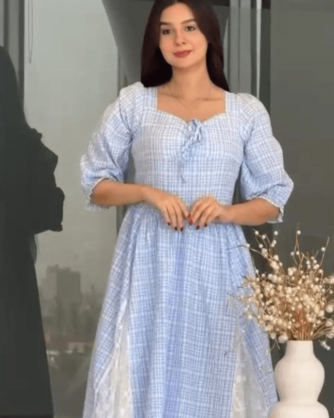 ستان بنقشة مربعات باللون الأزرق الفاتح. يتميز بتصميم عصري مع أكمام منتفخة تصل إلى الكوع. يحتوي على رباط في مقدمة الفستان عند منطقة الصدر، مما يمنحه مظهرًا أنثويًا وأنيقًا. الفستان يمتاز بطوله المتوسط مع تفاصيل من الدانتيل الأبيض عند الجوانب السفلى مما يضيف لمسة من الرقة.