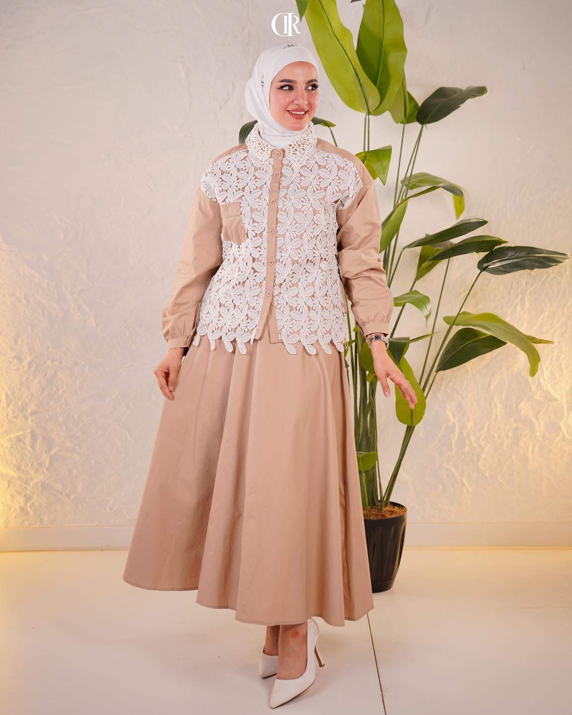 الألوان: الفستان باللون البيج الفاتح مع الكروشيه الأبيض، مما يمنح المظهر تباينًا جميلًا وأنيقًا.