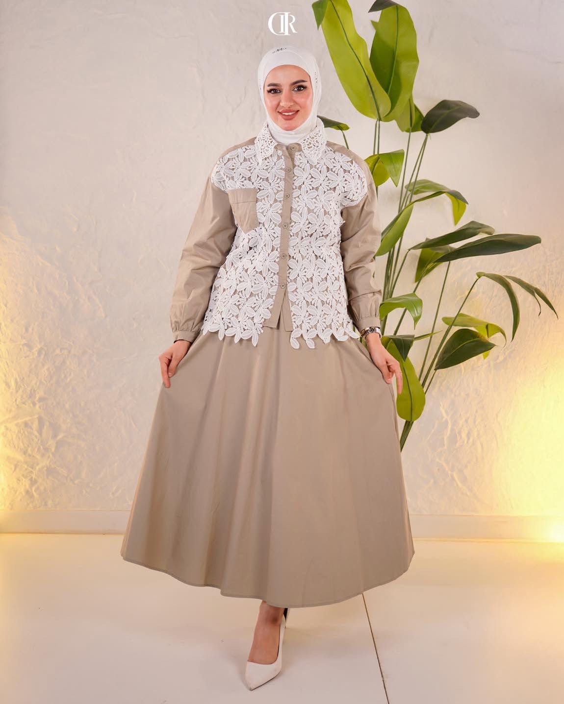فستان نسائي طويل باللون البيج الفاتح، يتميز بتصميم أنيق. الجزء العلوي من الفستان مزود برباط أبيض مزخرف على شكل تطريزات وردية، مع أزرار في منتصف الصدر، مما يضيف لمسة من الأناقة والفخامة. التنورة مريحة وطويلة، مما يجعل الفستان مثاليًا للارتداء اليومي أو للمناسبات التي تتطلب ملابس محتشمة. بالإضافة إلى ذلك، تتميز الصورة بارتداء الحجاب الأبيض الذي يكمل المظهر بشكل جميل وأنيق.خامه كتان قطني فاخر