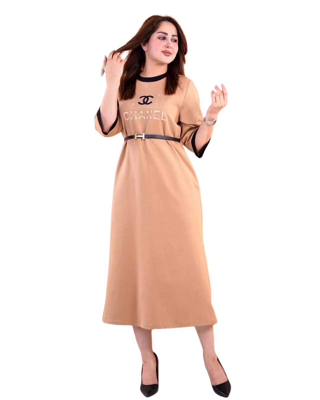 فستان لون بيجي فاتح مع حزام اسود