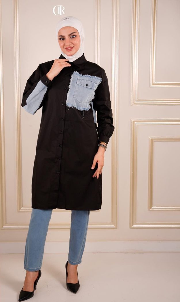 قميص طويل اسود بأكمام طويلة مع تفاصيل من اللون البيجي الفاتح في الجيوب والأكتاف، مريح وخفيف نوعيه ممتازة