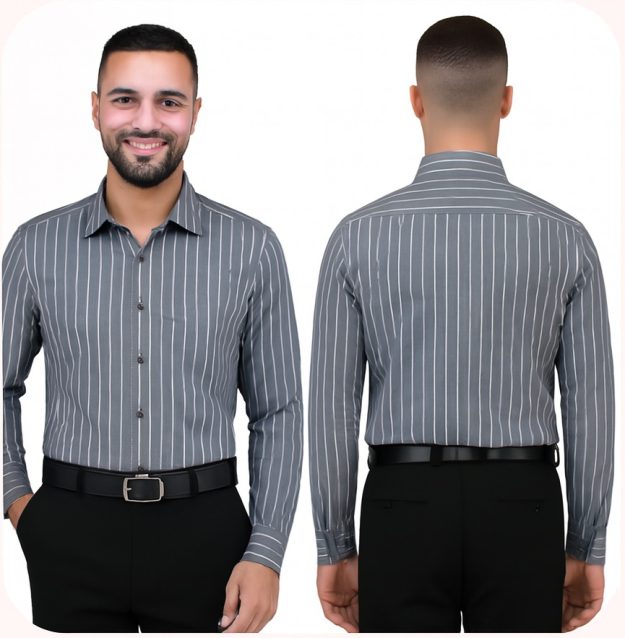 قميص رجالي رمادي مخطط – تصميم كلاسيكي بلمسة عصرية