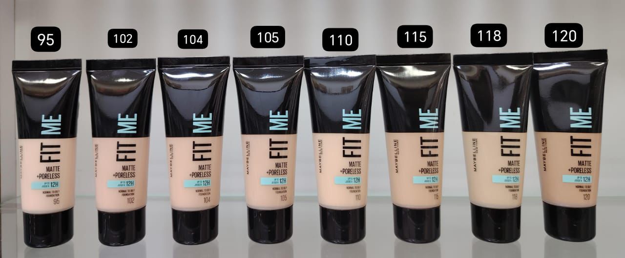 كريم الأساس من ماركة “Maybelline Fit Me” مع تفاصيل الأرقام التي تشير إلى الألوان المختلفة للكريمات.