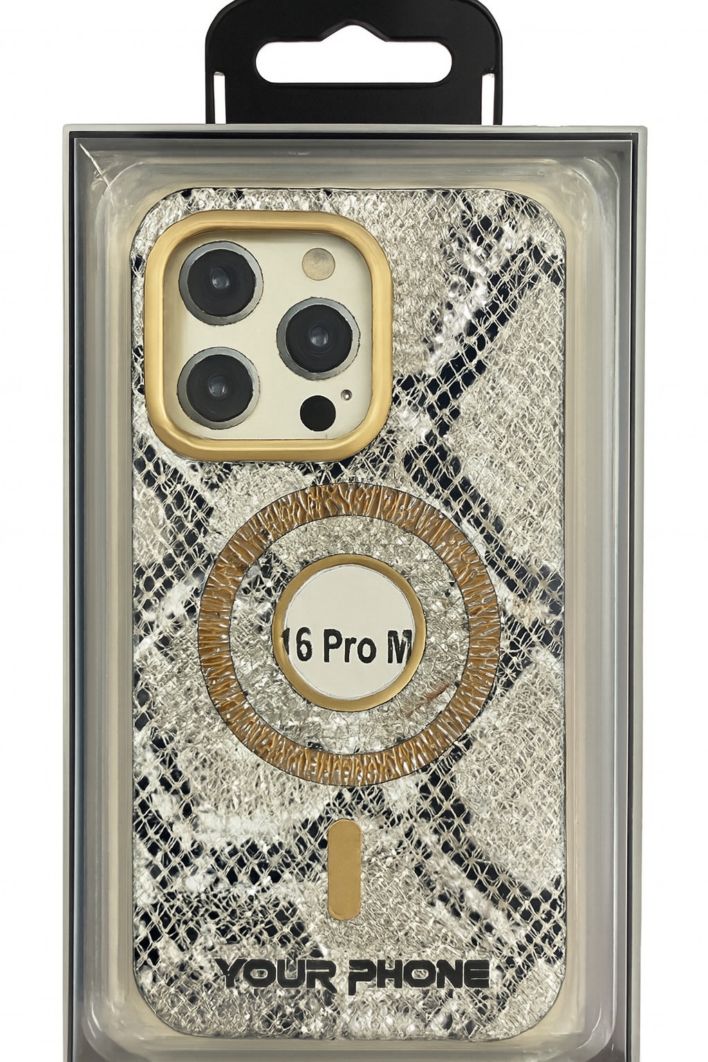 التصميم: تصميم مستلهم من نمط جلد الثعبان، مع دائرة ذهبية محيطة بالعلامة المكتوب عليها “16 Pro M”.