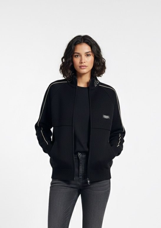 إطلالة مريحة تجمع بين الأسلوب العصري والراحة اليومية. تأتي الكنزة بتصميم رياضي بلمسة أنثوية أنيقة، مصنوعة من خامة عالية الجودة تمنحك الدفء والمرونة. مزوّدة بسحّاب أمامي وجيبين جانبيين لمزيد من العملية، مع خطوط بارزة على الأكمام تضيف لمسة من الحيوية إلى التصميم.