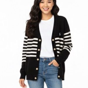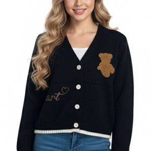 كنزة نسائية عصرية باللون الأسود، بتصميم مميز يحمل رسمة دمية لا بوبو (La Bobo) الشهيرة بطابعها اللطيف والمميز، مع تفاصيل باللون الذهبي تضيف لمسة من الحيوية والأناقة. مصنوعة من خامة قطنية ناعمة ومريحة، تمنحك الدفء في الأيام الباردة، ومثالية للإطلالات اليومية الكاجوال.