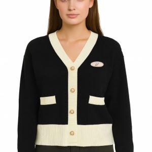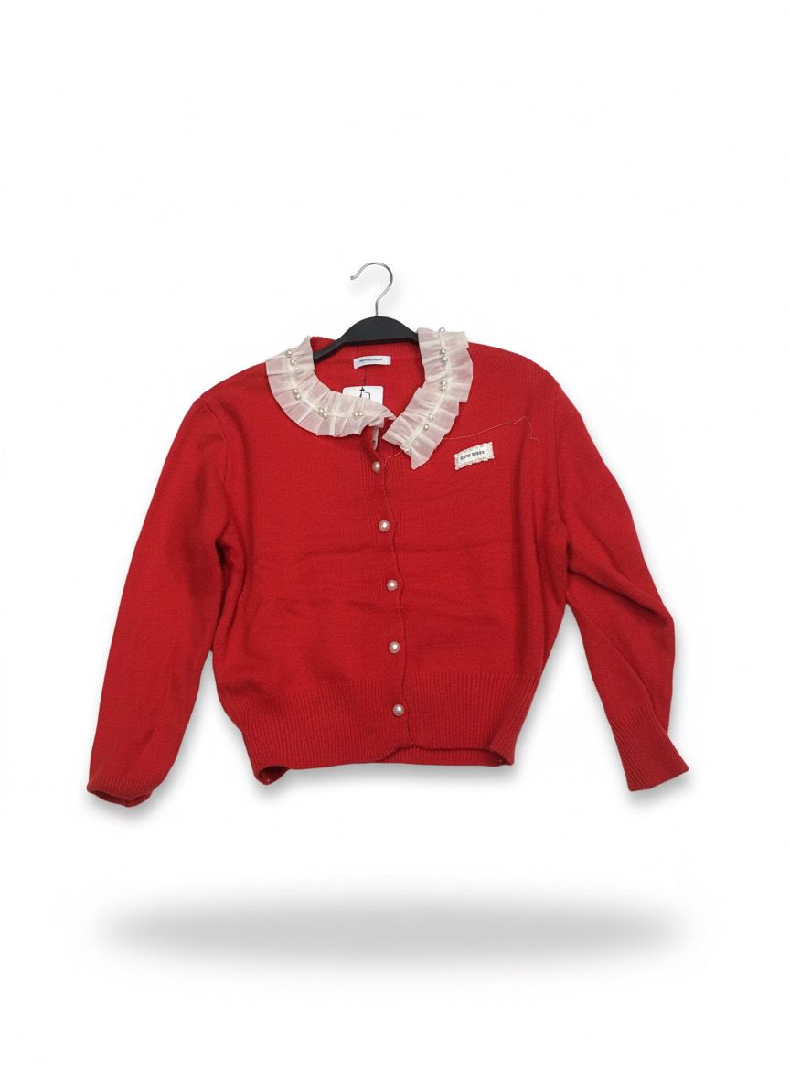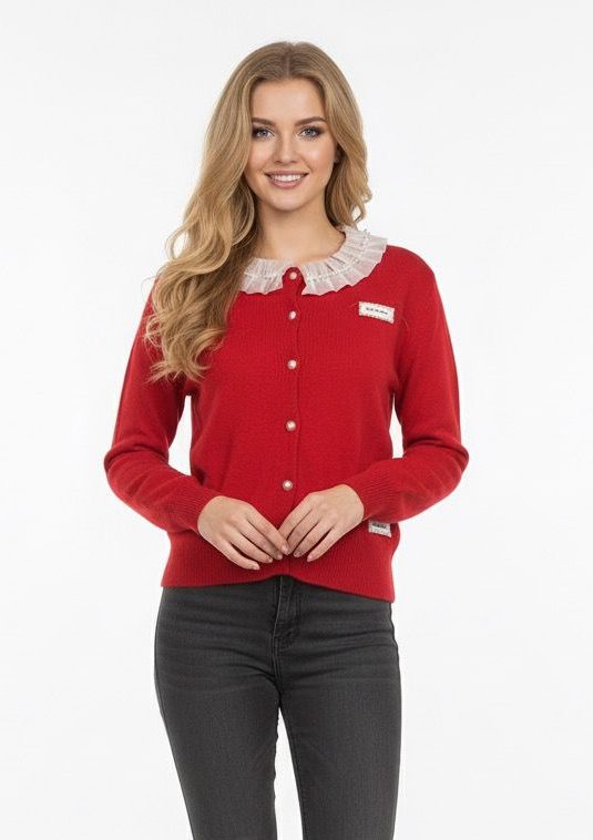 كنزة نسائية أنيقة باللون الأحمر بتصميم يجمع بين الكلاسيكية والأنوثة الراقية. تتميز بياقة دانتيل بيضاء مزينة باللؤلؤ تضيف لمسة ناعمة وفريدة على الإطلالة، مع أزرار أمامية لؤلؤية تضفي لمسة من الفخامة. الخامة ناعمة ومريحة على البشرة، مما يجعلها مثالية للإطلالات الشتوية أو الخريفية الهادئة.