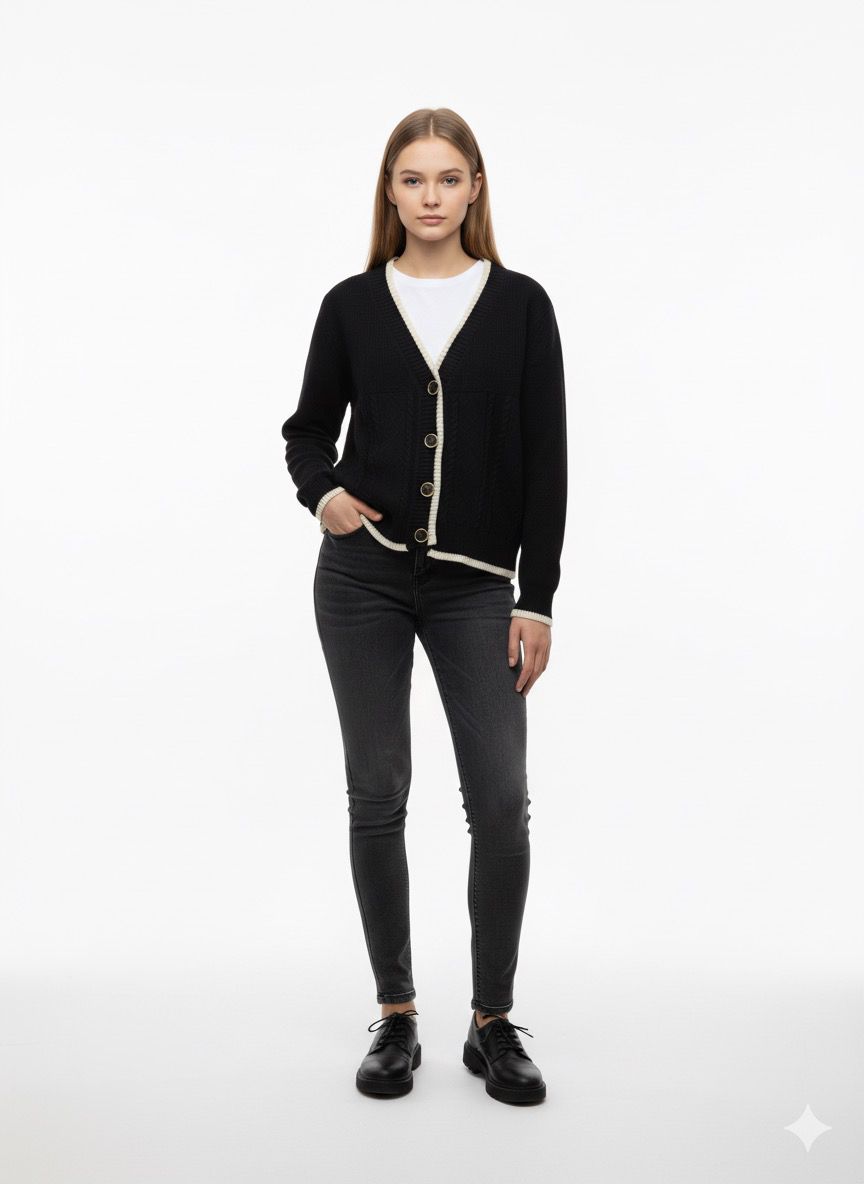 أضيفي لمسة من الأناقة والدفء إلى إطلالتك مع هذه الكنزة المحبوكة ذات التصميم الكلاسيكي، المثالية لأيام الخريف والشتاء.