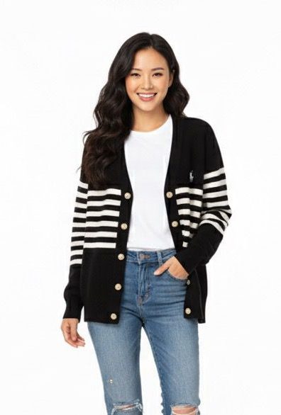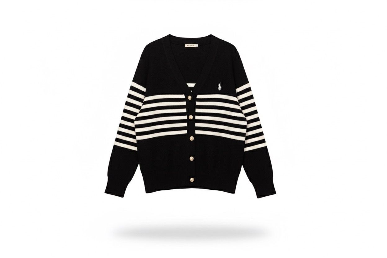 كنزة نسائية بتصميم يجمع بين الأناقة والراحة، تأتي بخطوط أفقية بيضاء على خلفية سوداء تمنح مظهراً عصرياً وكلاسيكياً في الوقت نفسه.