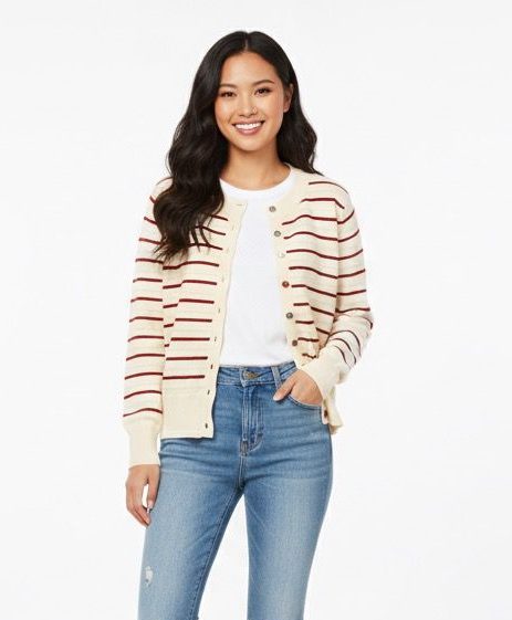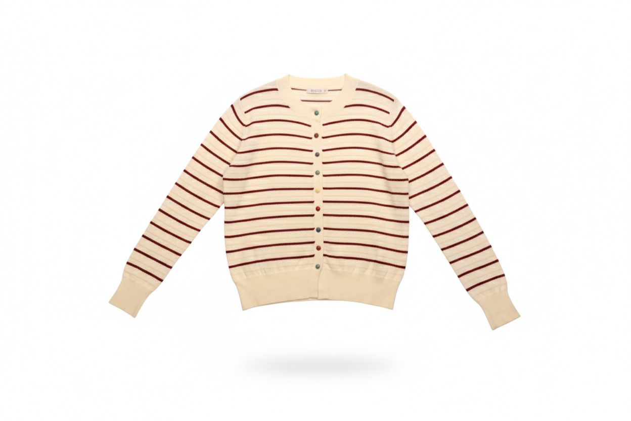 كنزة نسائية ناعمة بتصميم مخطط يجمع بين الأناقة والبساطة، تأتي بلون بيج فاتح مع خطوط حمراء رفيعة تمنح مظهراً عصرياً مريحاً. تتميز بتفاصيل أزرار أمامية ملونة تضيف لمسة شبابية فريدة، مع خامة تريكو ناعمة توفر دفئاً وأناقة في نفس الوقت.