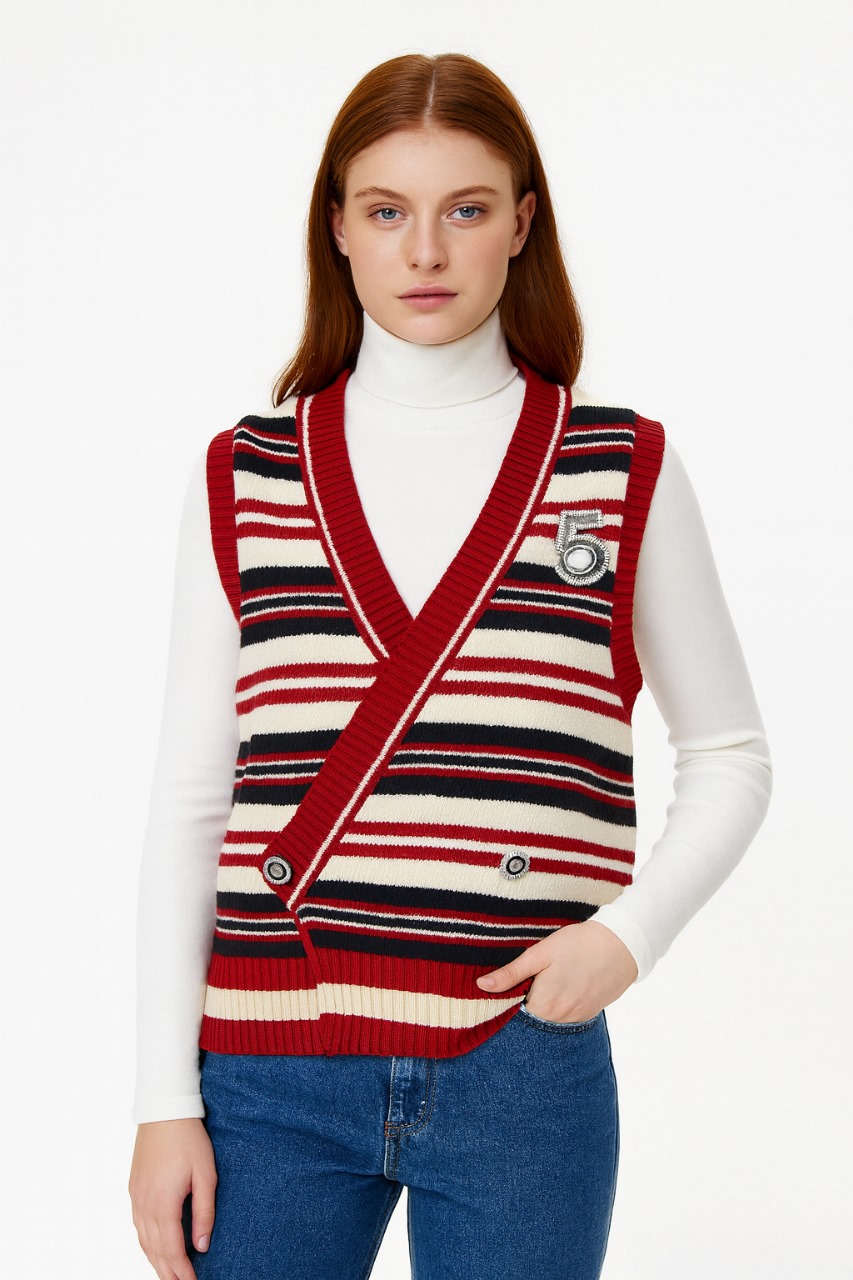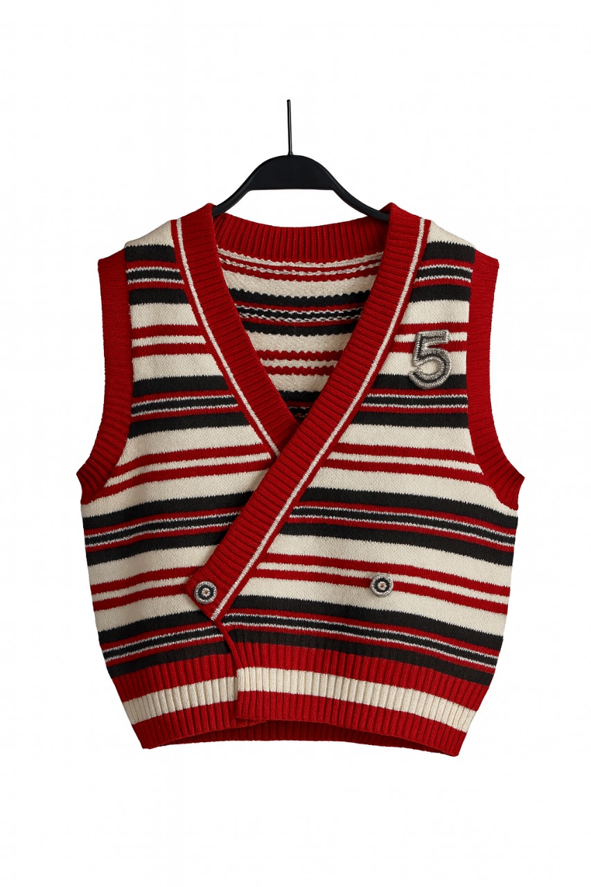 كنزة نسائية أنيقة بتصميم فريد بدون أكمام، تجمع بين الأناقة الكلاسيكية واللمسة العصرية. تأتي باللونين الأحمر والعاجي مع خطوط بالأسود لإطلالة شبابية مميزة. يتميز التصميم بياقة على شكل V عميقة متقاطعة مع أزرار أمامية صغيرة وزخرفة رقم 5 المطرزة تضيف لمسة رياضية أنيقة.