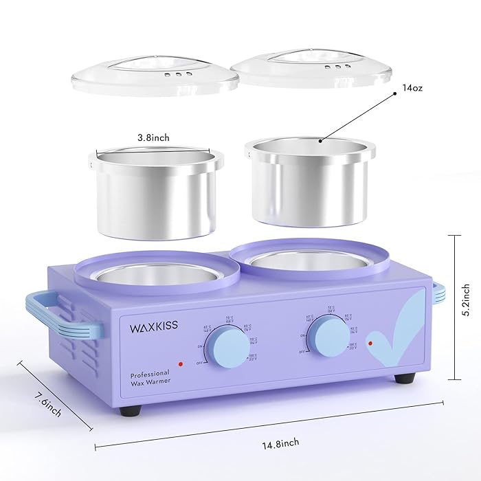 اكتشفي تجربة إزالة الشعر الاحترافية في منزلك مع جهاز تسخين الشمع من WAXKISS، المصمم بأناقة باللون البنفسجي العصري ولمسات من الأزرق الفاتح ليمنحك إحساسًا بالفخامة والتميز في كل استخدام. يتميز هذا الجهاز المزدوج بوجود حاويتين منفصلتين مع أغطية محكمة، ما يتيح لك تسخين نوعين من الشمع في نفس الوقت بكفاءة وسهولة، ويوفر لك تحكمًا دقيقًا في درجة الحرارة بفضل أزراره الدائرية السهلة الاستخدام. صُنع الجهاز ليمنحك نتائج صالونات التجميل بجودة عالية وسرعة فائقة، فهو الحل الأمثل للسيدات اللواتي يبحثن عن نعومة تدوم طويلاً دون عناء الذهاب للمراكز المتخصصة. يوفر تسخينًا متساويًا للشمع، مما يضمن إزالة شعر فعّالة ولطيفة على البشرة دون تهيج. صُمم الجهاز من مواد متينة وعالية الجودة لضمان الاستخدام الآمن والمريح، مع مقابض جانبية لسهولة الحمل والتنقل. استمتعي ببشرة ناعمة كالحرير وثقة متجددة في كل جلسة عناية، واجعلي جهاز WAX Kiss Wax Warmer خيارك الأمثل لتحقيق نتائج احترافية في منزلك