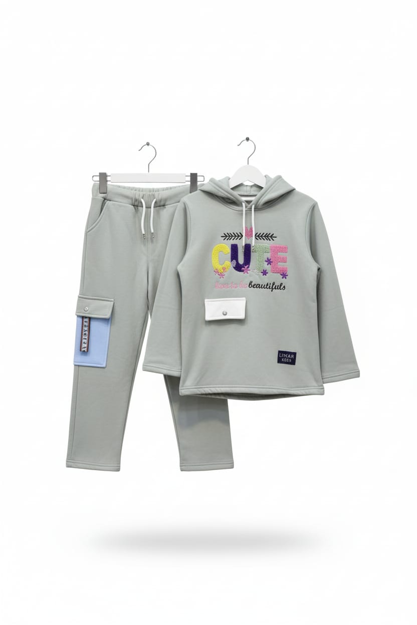 أضيفي لمسة من الحيوية والراحة إلى إطلالة طفلتك مع هذا الطقم العصري المصمم بلون رمادي فاتح، يتكون من هودي بقبعة وسروال متناسق. يتميز الهودي بطبعة CUTE ملونة مزينة برسومات زهور ونجوم، مع عبارة beautiful المكررة بأسلوب طفولي أنيق، مما يمنح التصميم طابعًا مبهجًا ومحببًا للأطفال.