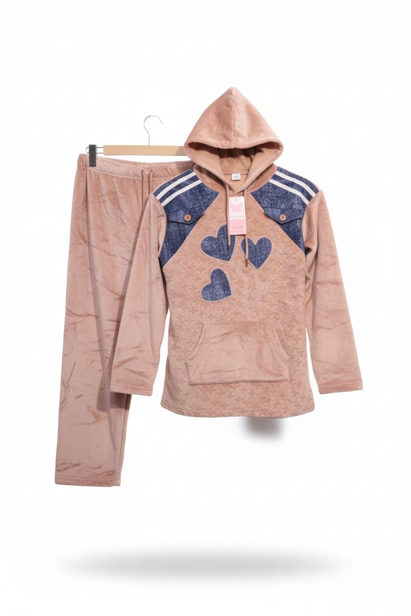النوع: طقم أطفال قطعتان (هودي + بنطال)اللون: وردي فاتح مع تفاصيل زرقاءالخامة: قماش ناعم ومخمليالتصميم: طبعة قلوب، رقعات كتف بأزرار، جيب أمامي، قبعة مدمجةالقصة: مريحة وعمليةالاستخدام: مثالي للمنزل، النوم، أو الإطلالات اليومية💡 تصميم يجمع بين الراحة والمرح، يناسب الأطفال الذين يحبون التفاصيل اللطيفة والإطلالة المتناسقة.