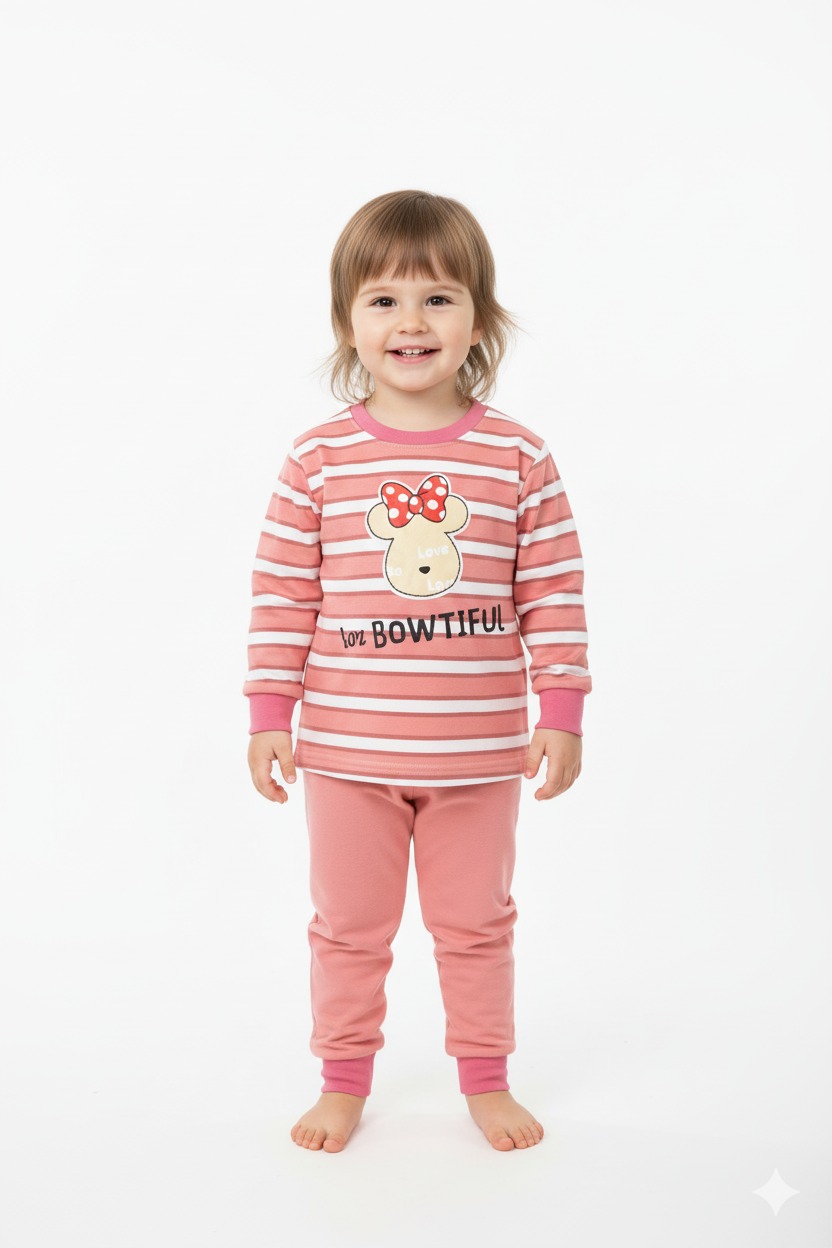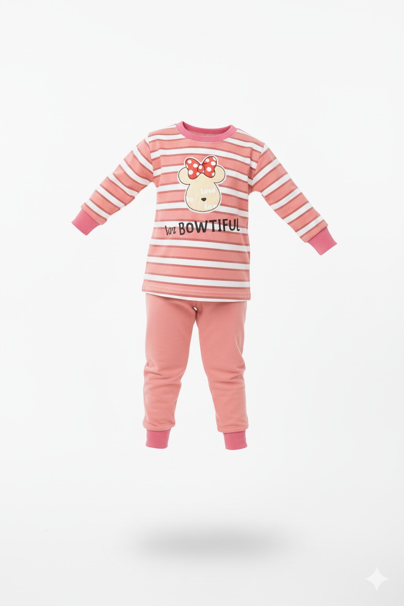 ضيفي لمسة من الأناقة والمرح إلى إطلالة طفلتك مع هذا التراك الطفولي المصمم بلون وردي جذاب ونقشة مخططة ناعمة. يتميز الجزء العلوي بصورة دب كرتوني لطيف مزين بفيونكة منقطة بالأحمر والأبيض، مع عبارات مرحة مثل Love so Love وtoo BOWTIFUL تضفي طابعًا طفوليًا محببًا.