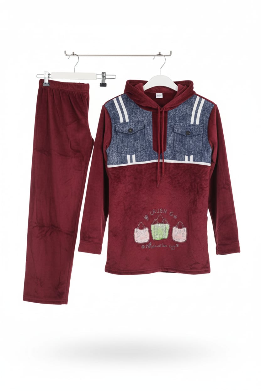 أضيفي لمسة من الأناقة والمرح إلى إطلالة طفلتك مع هذا الطقم العصري المصمم بلون عنابي دافئ، يتكون من هودي بقبعة وسروال متناسق. يتميز الهودي بلوحة دنيم زرقاء على الصدر مزينة بخطوط بيضاء وجيوب بأزرار زخرفية، بالإضافة إلى طبعة “MY CRUSH GO” مع رسومات حقائب أنيقة تضفي طابعًا أنثويًا عصريًا.