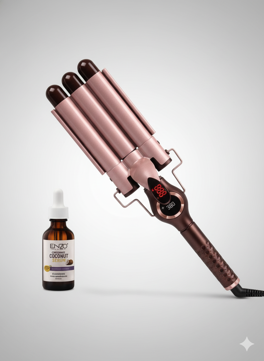 جهاز ENZO الاحترافي مصمم ليمنحك تموجات عميقة وثابتة بفضل تصميمه الثلاثي وتقنية السيراميك المتطورة. مثالي للنساء اللي يحبّن الستايل المموج والنتائج السريعة، ويأتي مع سيروم جوز الهند للعناية بالشعر.